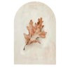 Warm, painterly oak leaf in earthy autumn tones against a textured cream backdrop. UV printed on ¼" wood with arched top. Back is unfinished maple with branded stamp. No hardware included.