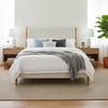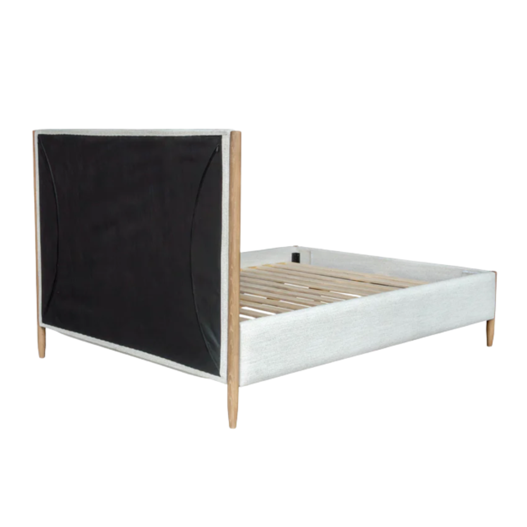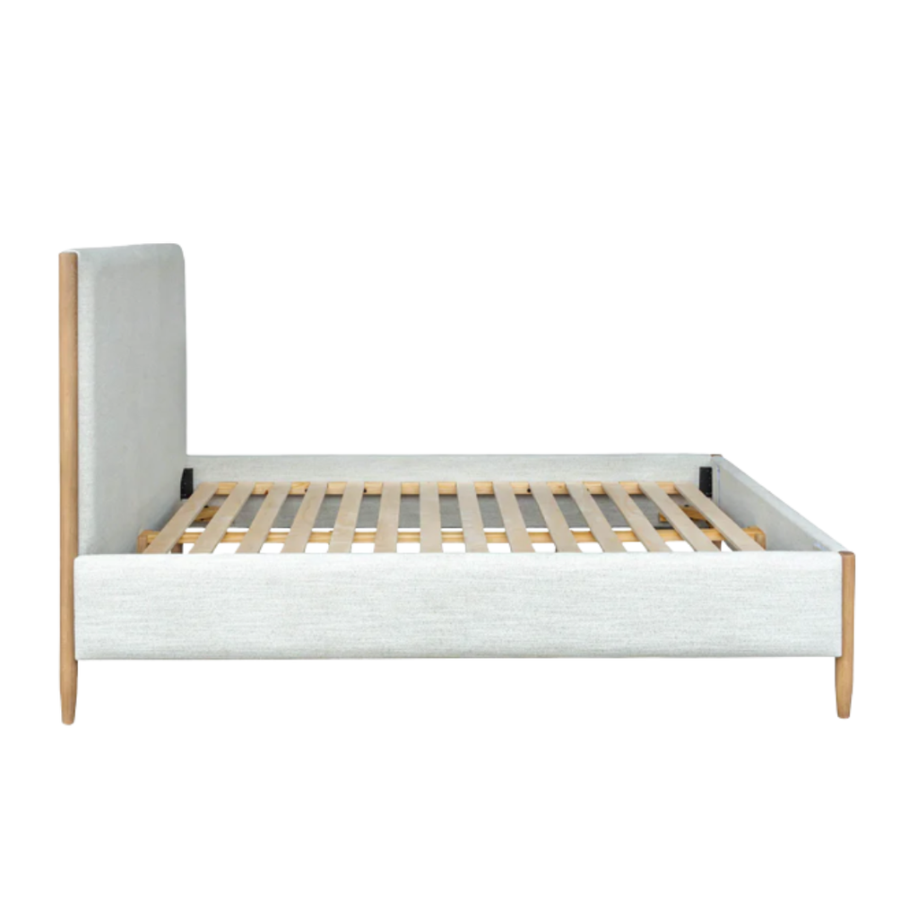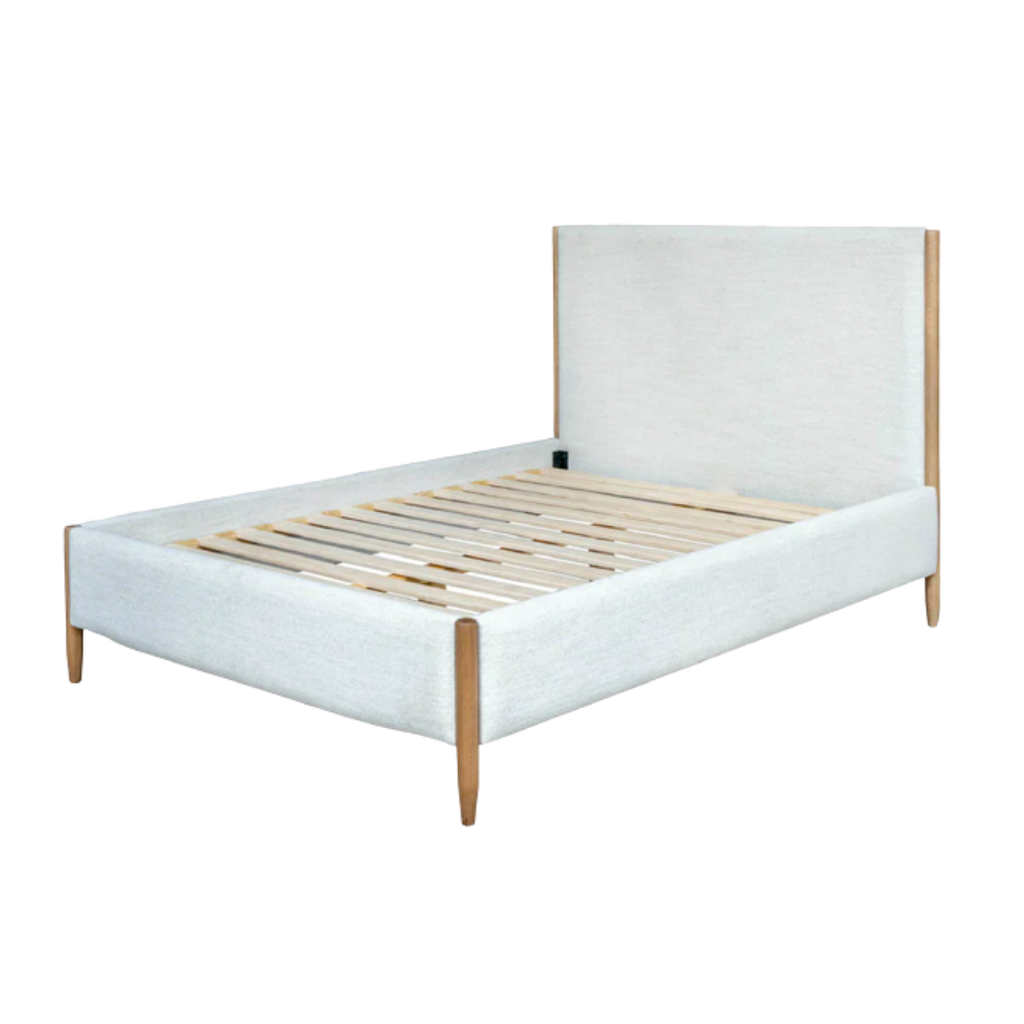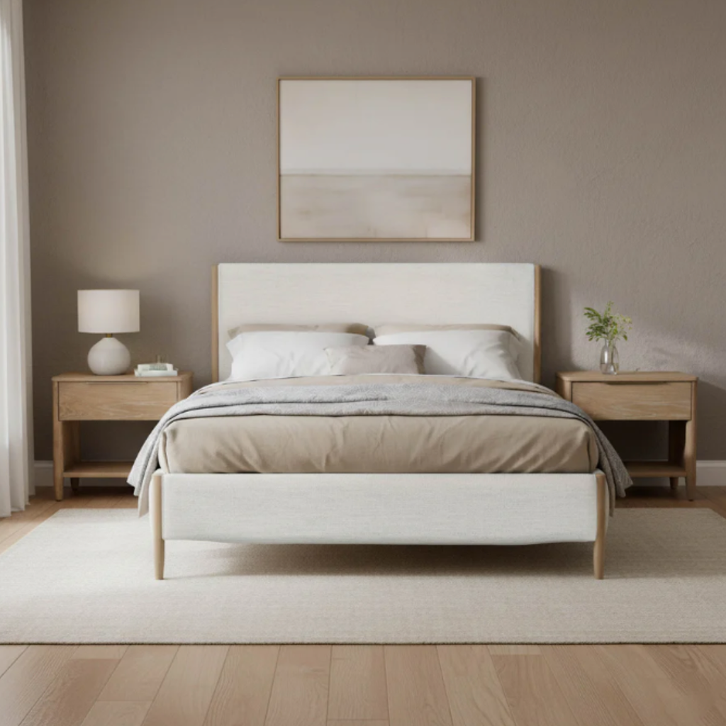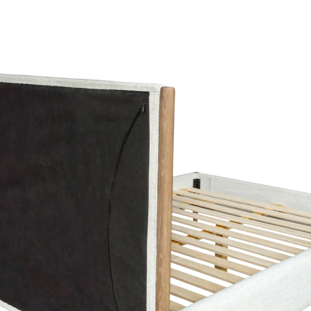 Designed with softness in mind, this upholstered bed combines warm oak tones and a gently padded frame for modern comfort.