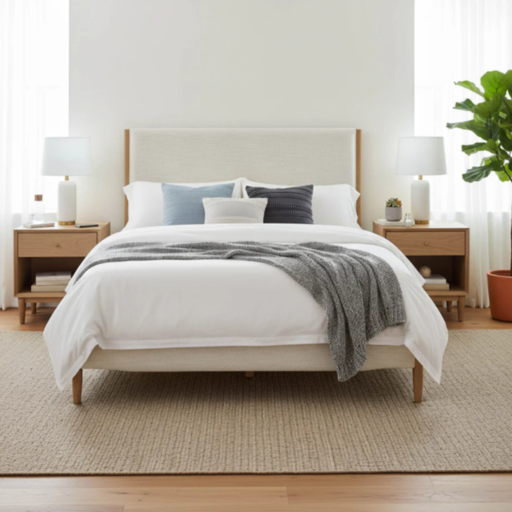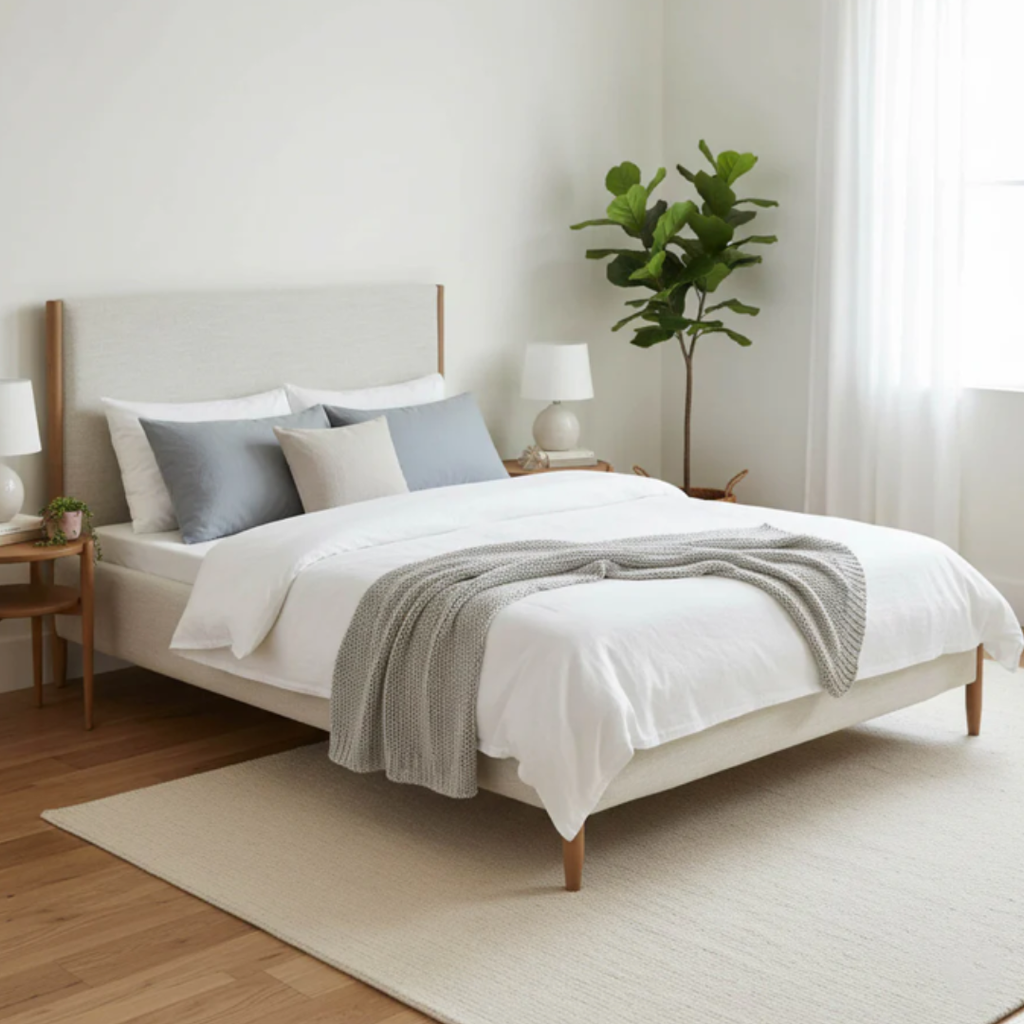 - Light neutral fabric contrasts with warm wood legs