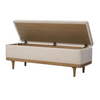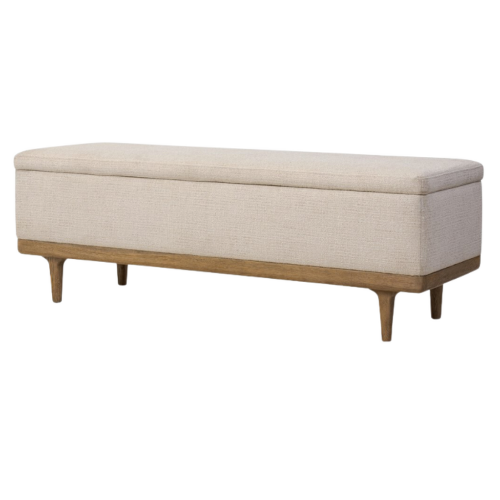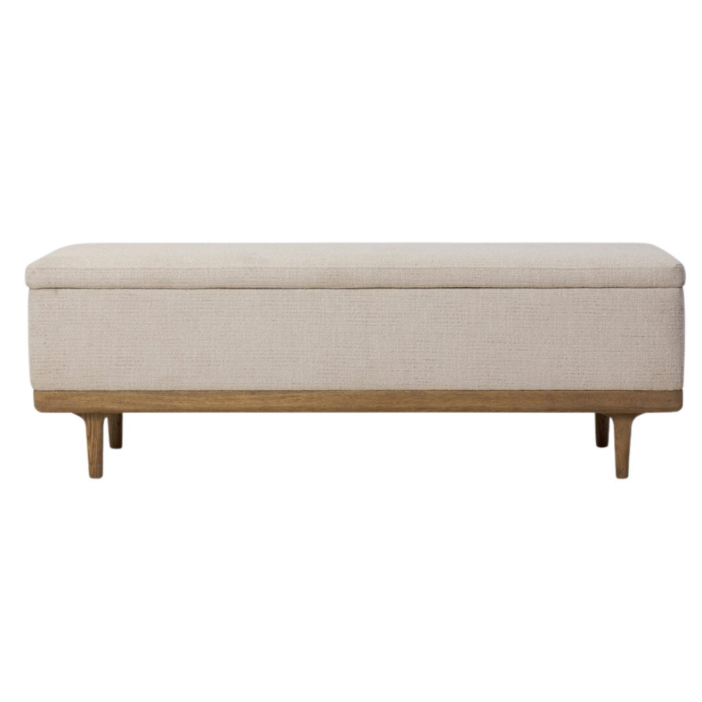 Wrapped in textural cream performance fabric, this spacious trunk doubles as seating at the foot of the bed — or anywhere. Store extra blankets, linens and more. Crafted from oak, the frame and tapered legs with Deco vibes are finished in a worn oak finish. Performance fabrics are specially created to withstand spills, stains, high traffic and wear, ensuring long-term comfort and unmatched durability.