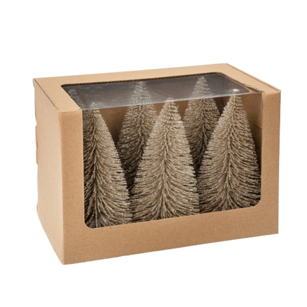 High in sparkle and shine, they instantly create that holiday feeling. Beautifully packaged in a set of 6, we arrange them with other trees of varying heights to create a festive forest scene.
