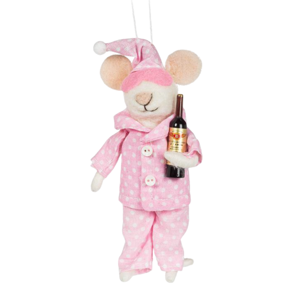 Introducing our whimsical Pajama Clad Mouse Ornament with a tiny wine bottle! With its relaxed smile and charming attire, this little mouse brings a touch of comfort and celebration to your decor. Perfect for wine enthusiasts and those who enjoy cozy evenings, it's a delightful addition to any collection or a thoughtful gift for someone who appreciates the finer things in life!