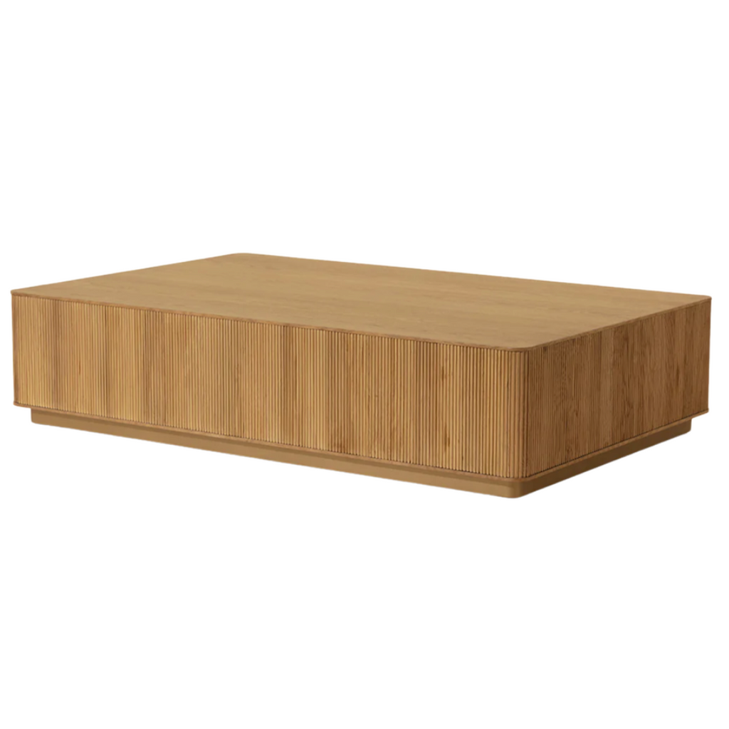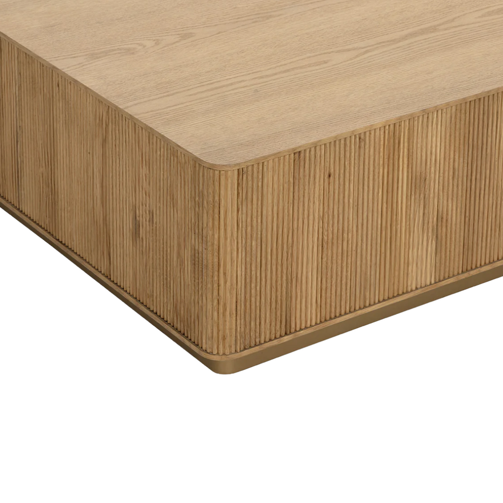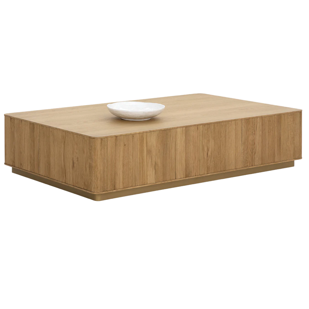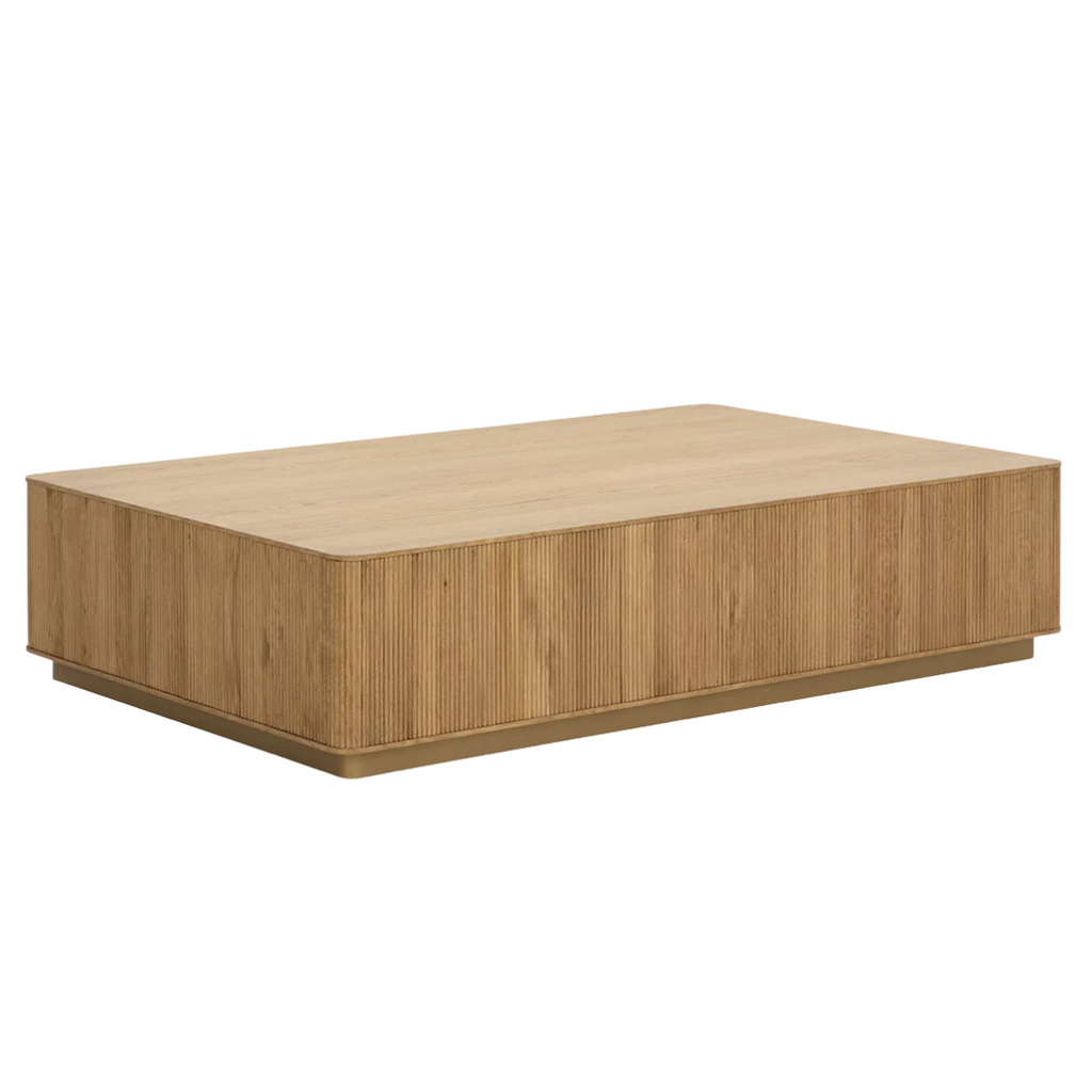 The Kalla Coffee Table brings form and function to life. Crafted with rustic oak wood and oak veneer with vertical reeding. A brushed gold steel base finishes the look.