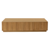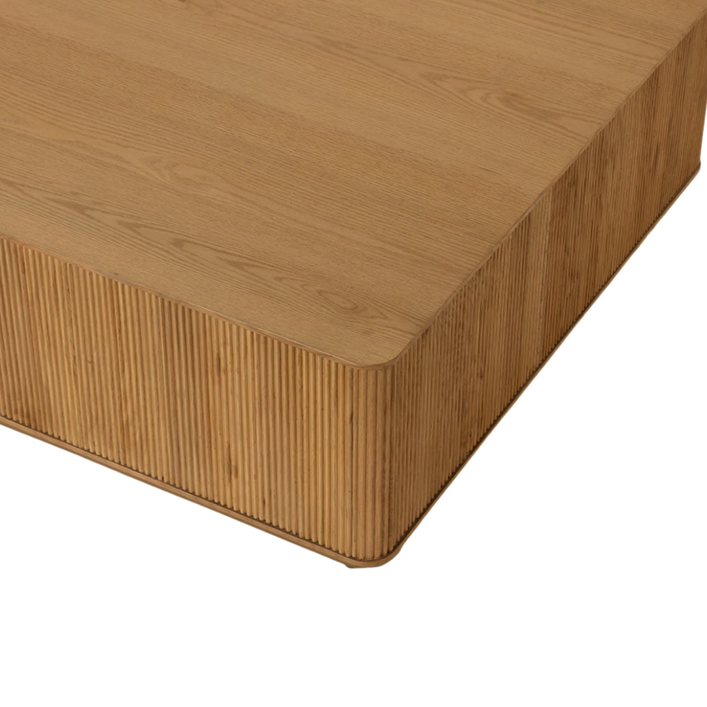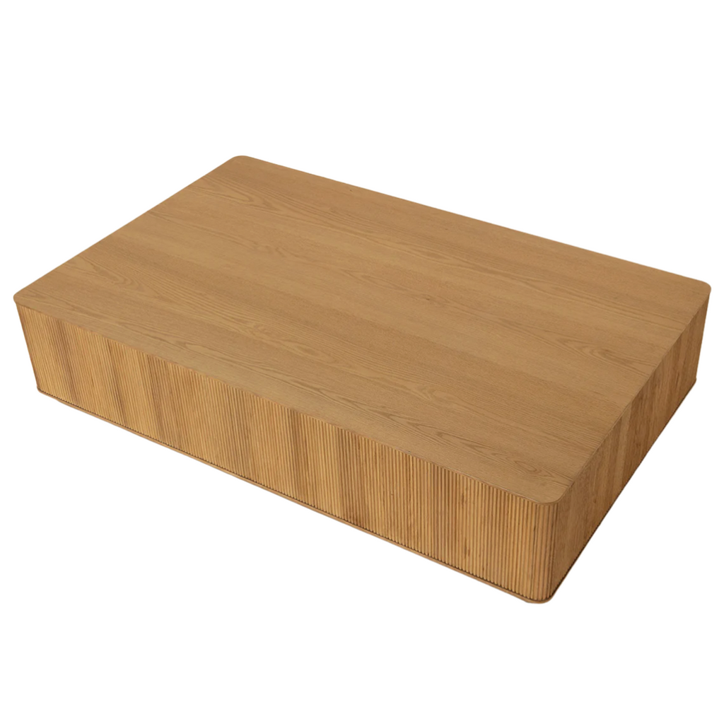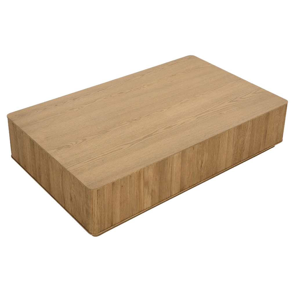 The Kalla Coffee Table brings form and function to life. Crafted with rustic oak wood and oak veneer with vertical reeding. A brushed gold steel base finishes the look.