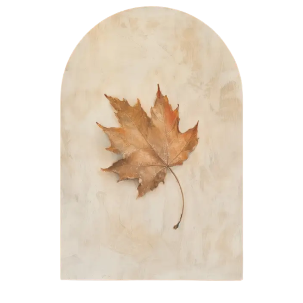 Minimalist autumn design with a painterly maple leaf in warm tones on a soft cream background. UV printed on ¼" wood with arched top. No hardware included.