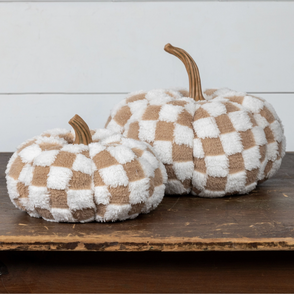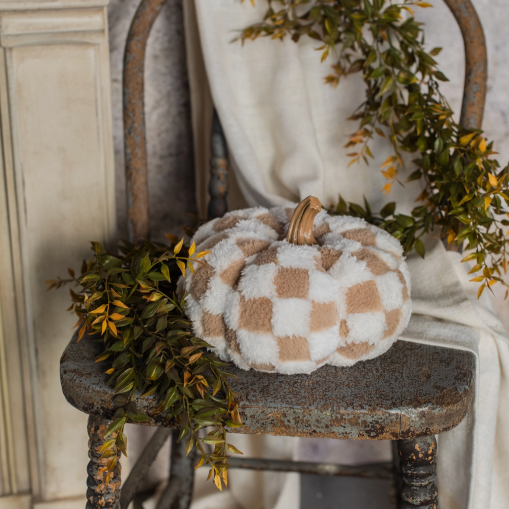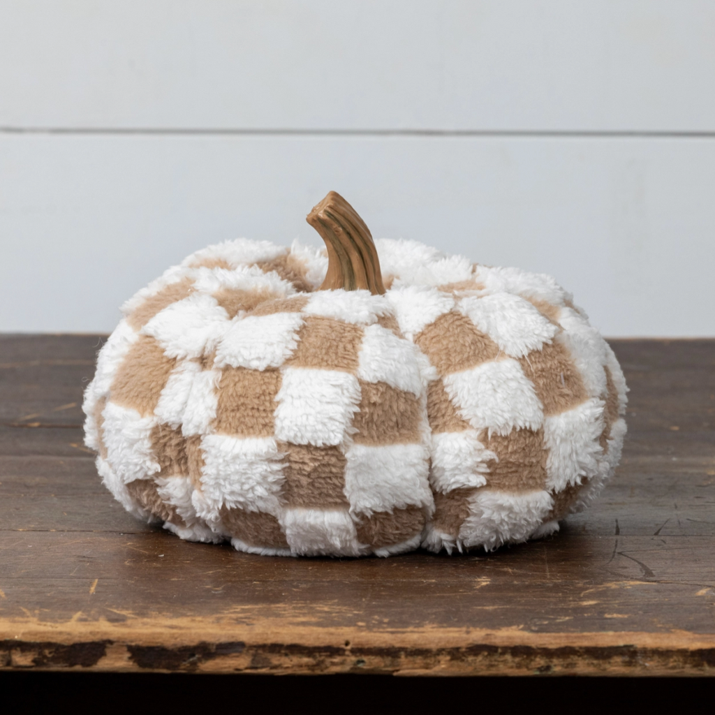 The 6.5" Brown & Cream Check Fabric Pumpkin by Ragon House is a charming addition to your home decor. With an 8.25" depth, this decorative tabletop object infuses your space with a warm, autumnal feel. Crafted with high-quality standards, it is a testament to Ragon House's 25 years of experience in the home decor industry. This pumpkin is an emblem of the brand's commitment to create products that inspire joy, creativity, and make a difference in people's lives. Perfect for both vintage and modern farmhouse aesthetics.