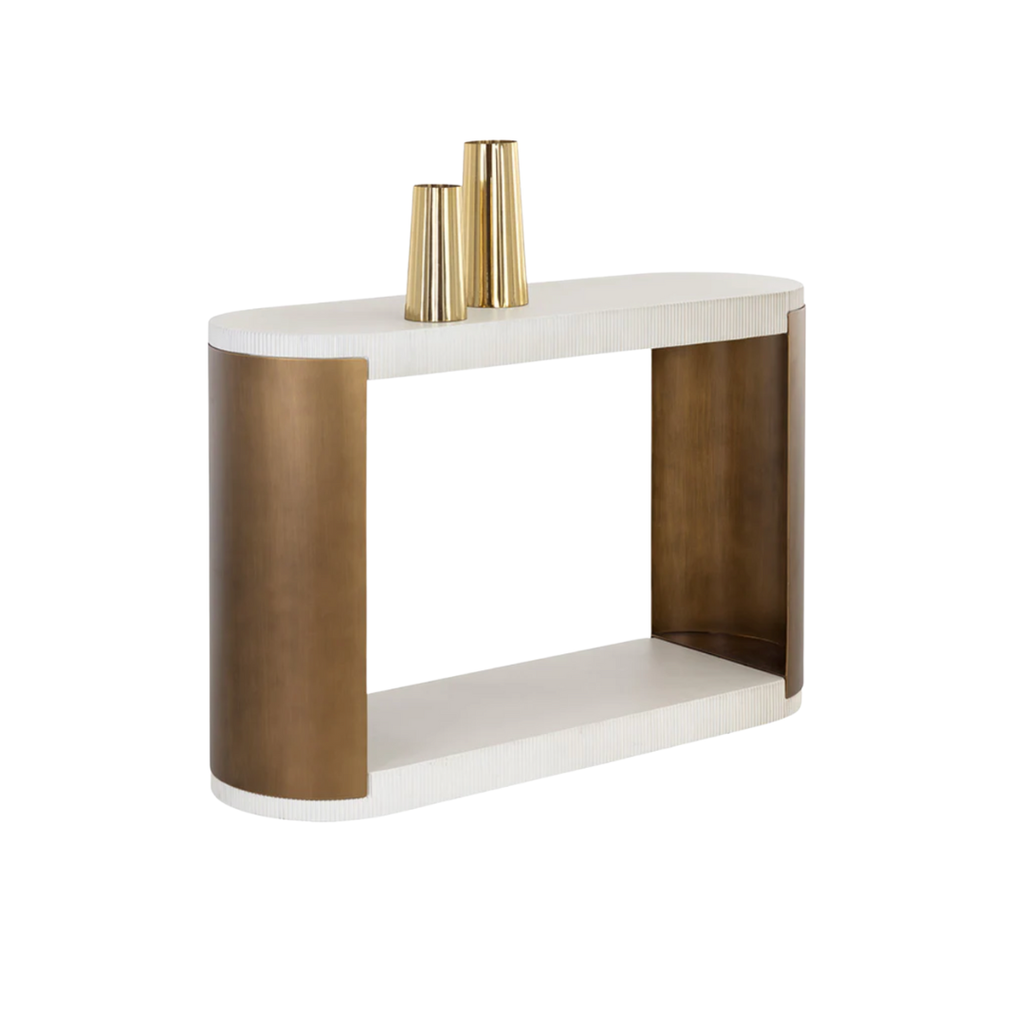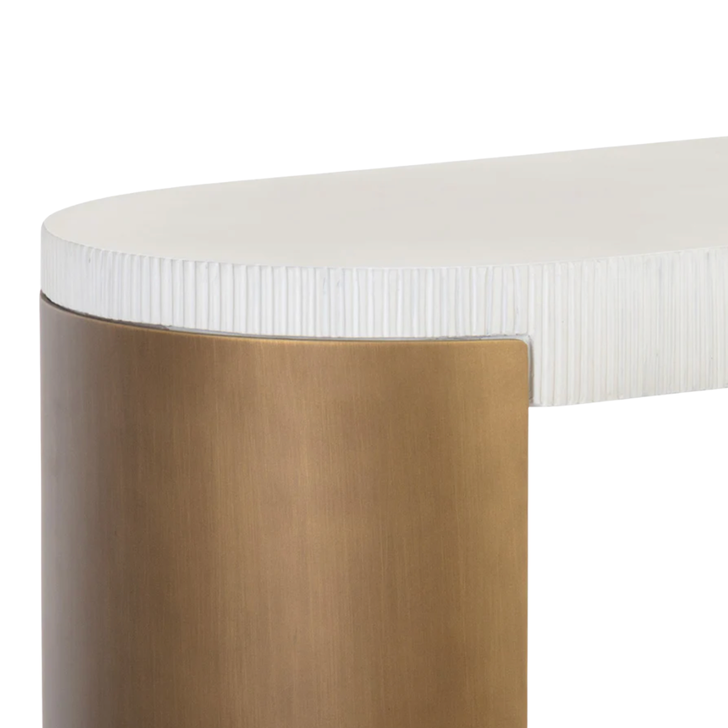 Combining old world influence with feminine flair, this stunning console table exudes opulence. Features a ridged white concrete top and base with a brass steel frame.