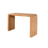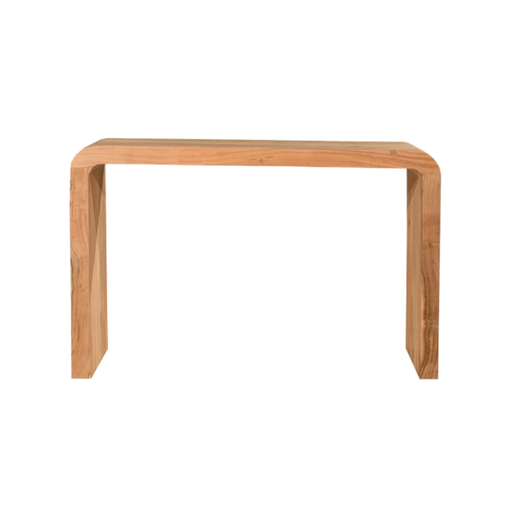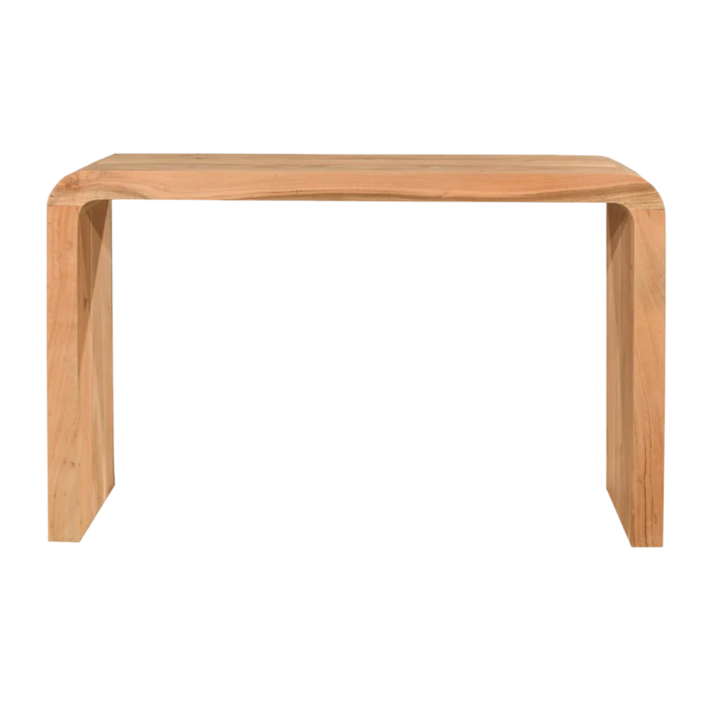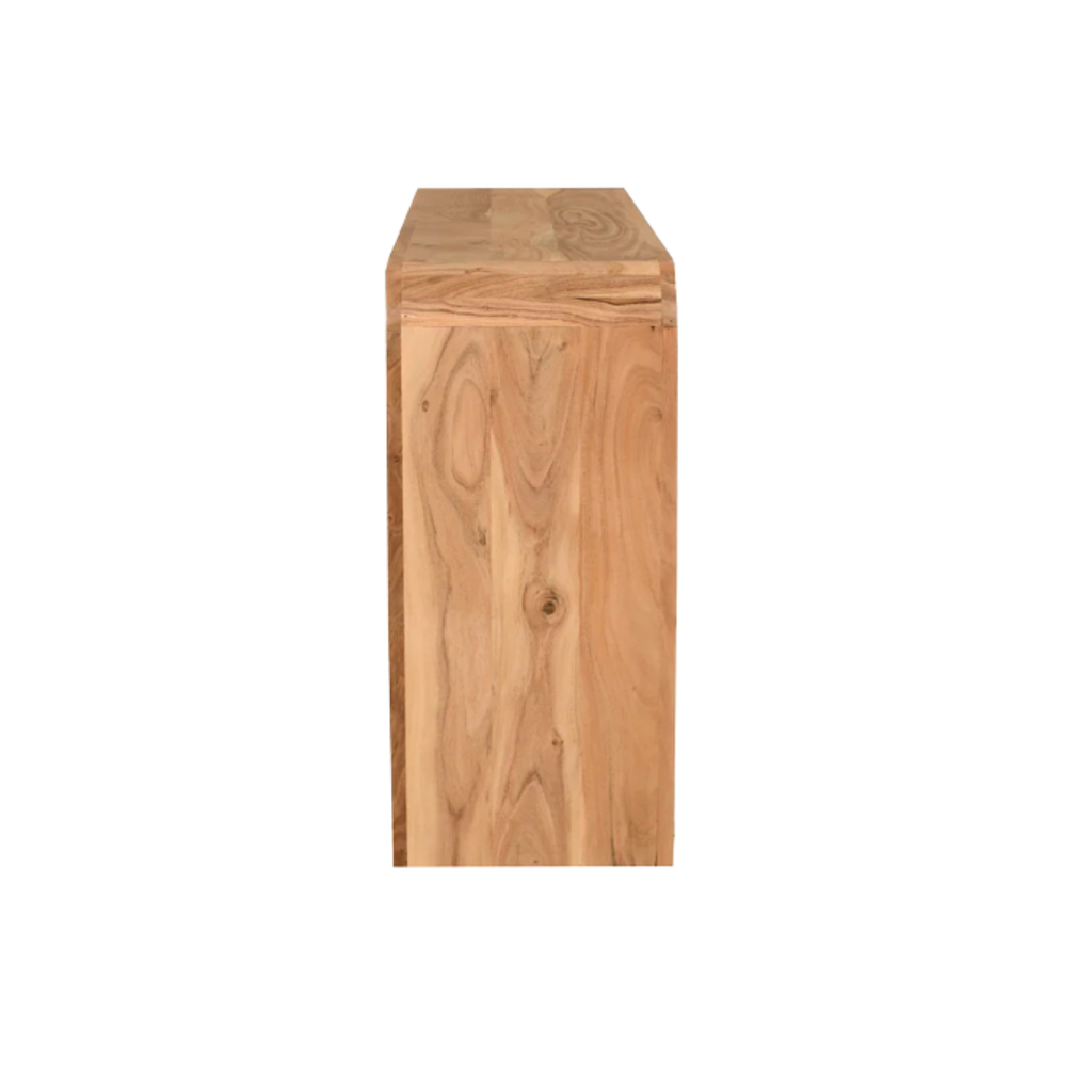 Bold and compact, this console showcases sculpted corners and handcrafted joinery. The natural acacia grain brings character to the simple form.