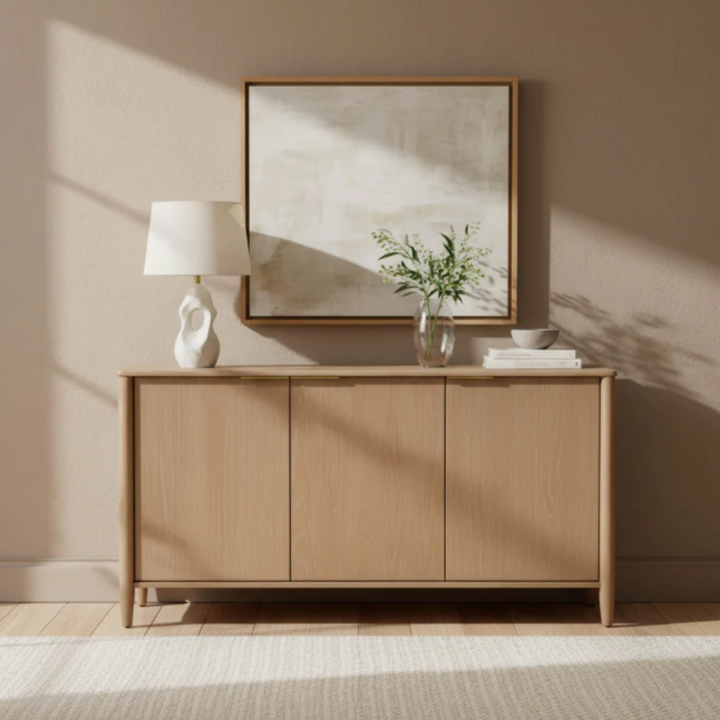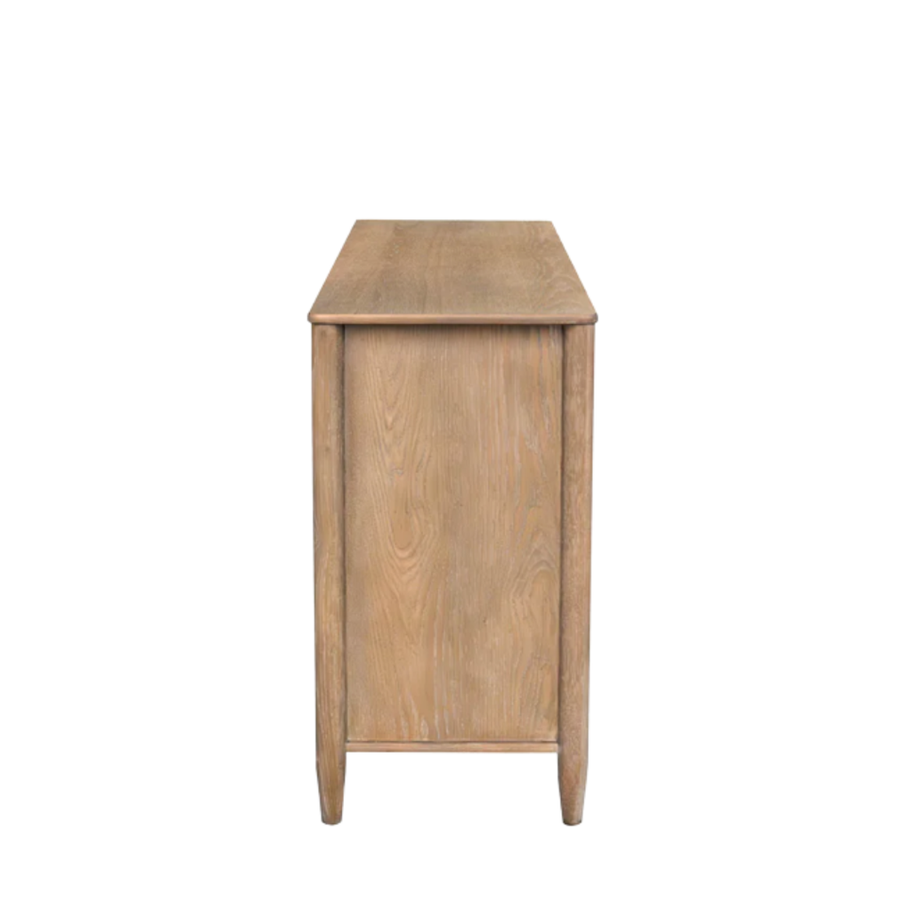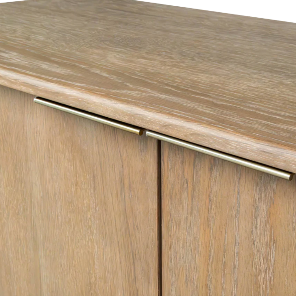 Subtle curves and hidden hardware define this clean-lined sideboard. Crafted for everyday function with a soft oak tone.
