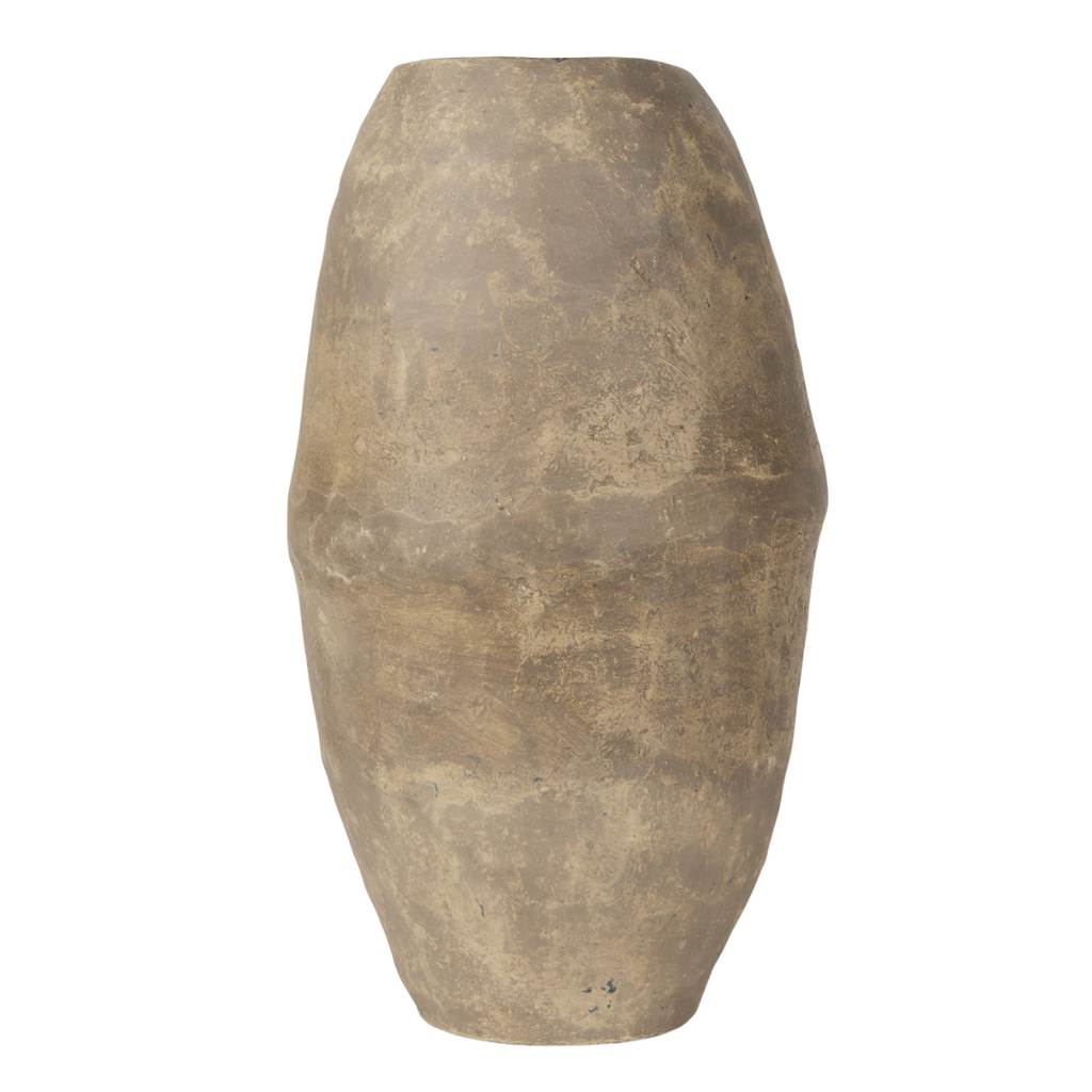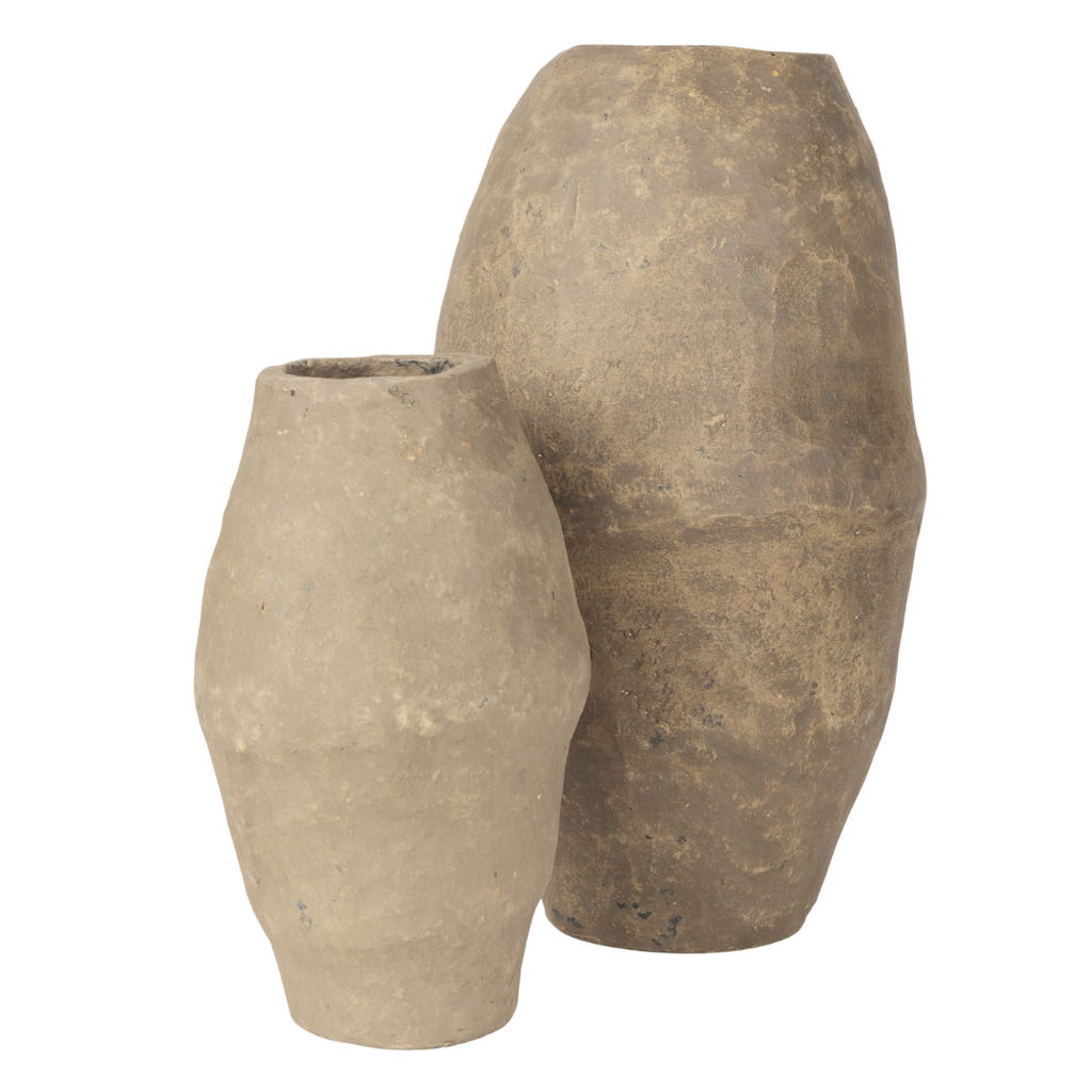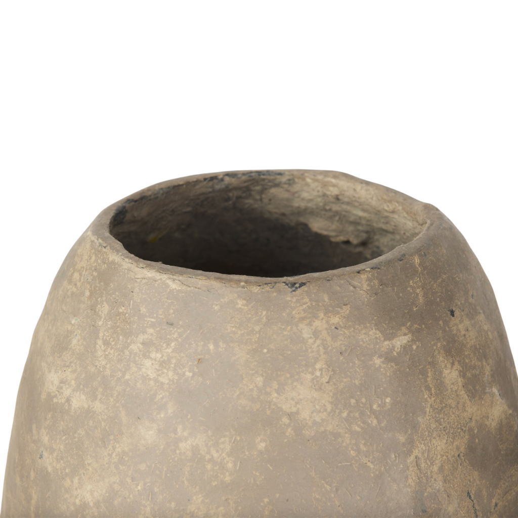 xThe Rundal Vase is a one-of-a-kind, handmade paper mache vase finished in a gray tone. This container-style vase features a decorative ridge towards the center and has a wide opening. It can be paired with the Rundal Small Vase. On its own Rundal makes a beautiful and unique home accent, or style with dried or artificial botanicals to add some additional color to any space. Named after the inspiring women artisans in India, no two pieces are the exact same. These unique, hand-crafted pieces of decor are made from upcycled materials and transformed into beautiful home accents.