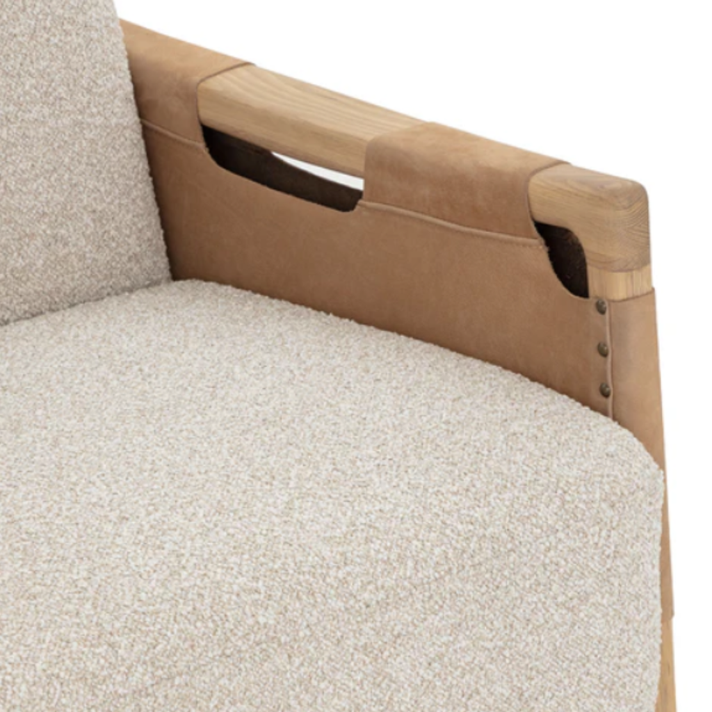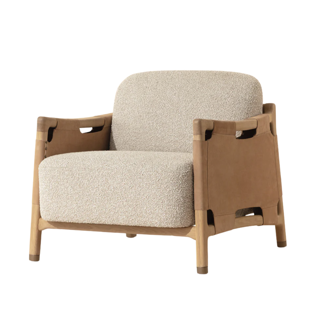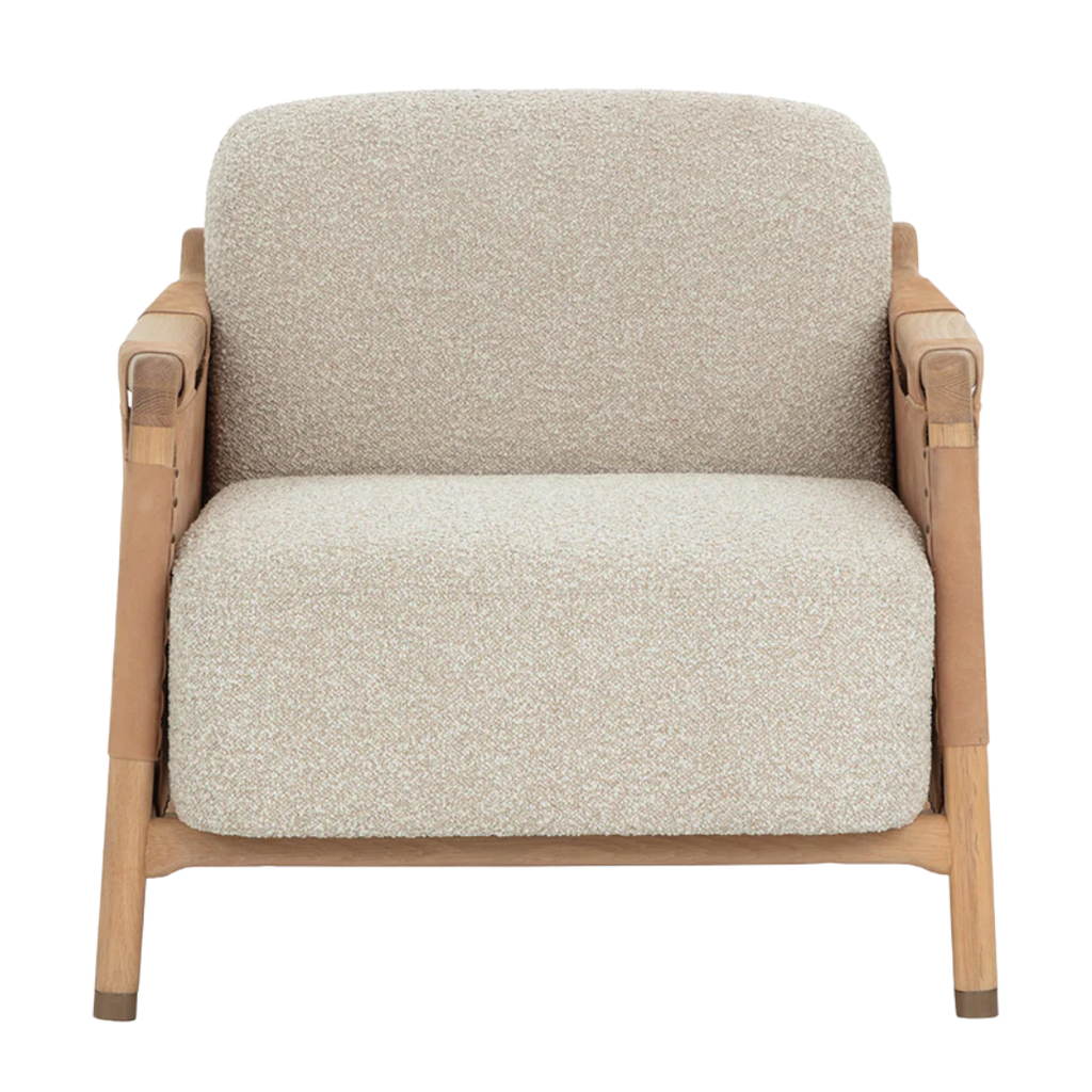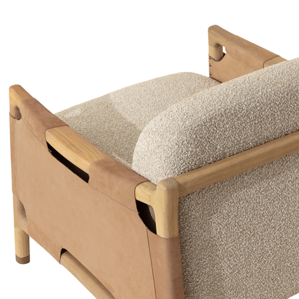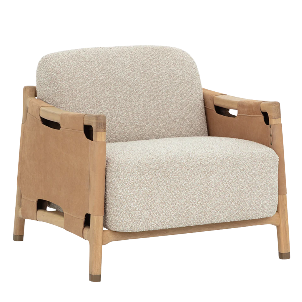 The Calloway Lounge Chair combines robust craftsmanship with inviting comfort. Its solid oak frame is accented with wide nubuck tan leather straps, secured by hand-applied nailheads for a distinctive touch. Generous cushions are upholstered in in textured santa cruz oatmeal fabric, while gold-capped feet finish the piece with with a subtle note of polish.