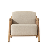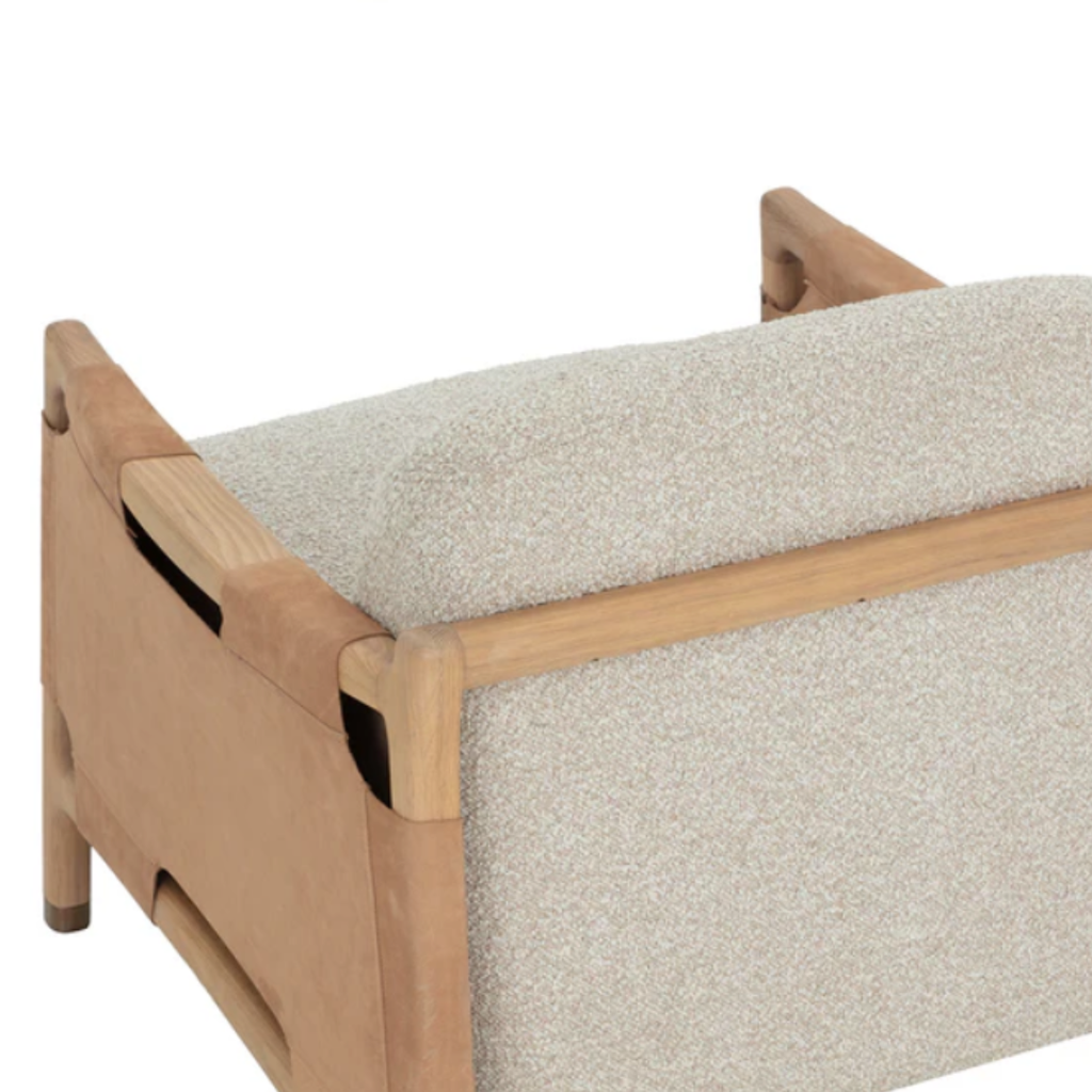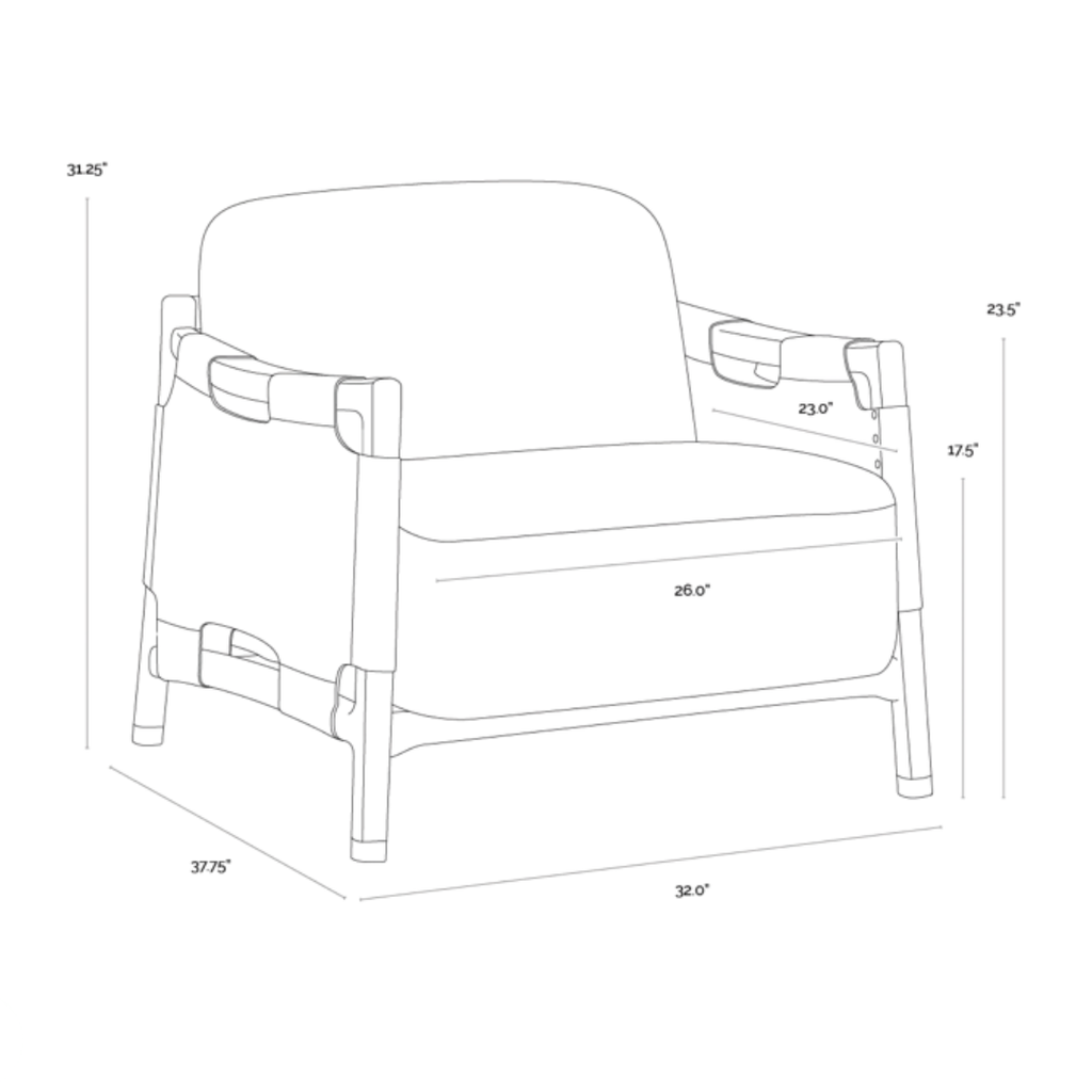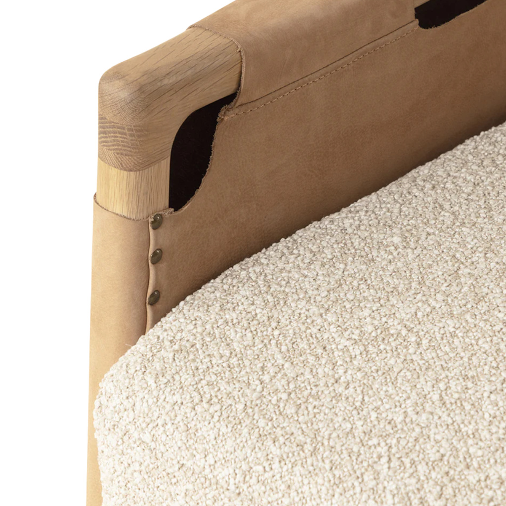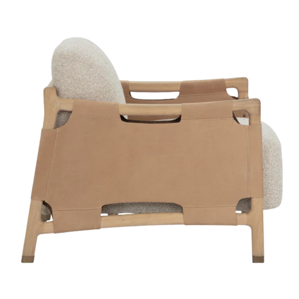 The Calloway Lounge Chair combines robust craftsmanship with inviting comfort. Its solid oak frame is accented with wide nubuck tan leather straps, secured by hand-applied nailheads for a distinctive touch. Generous cushions are upholstered in in textured santa cruz oatmeal fabric, while gold-capped feet finish the piece with with a subtle note of polish.