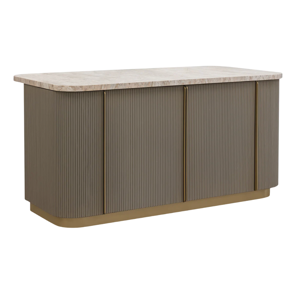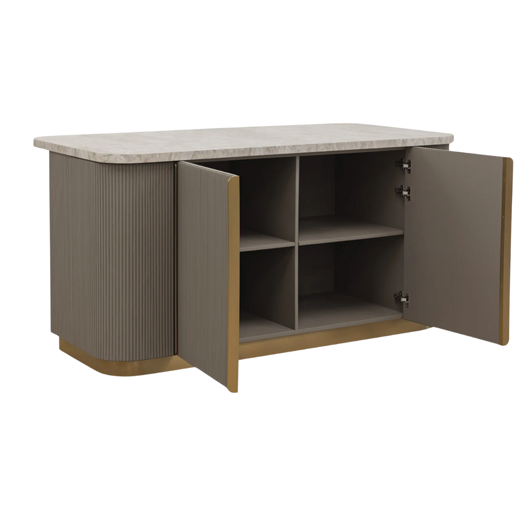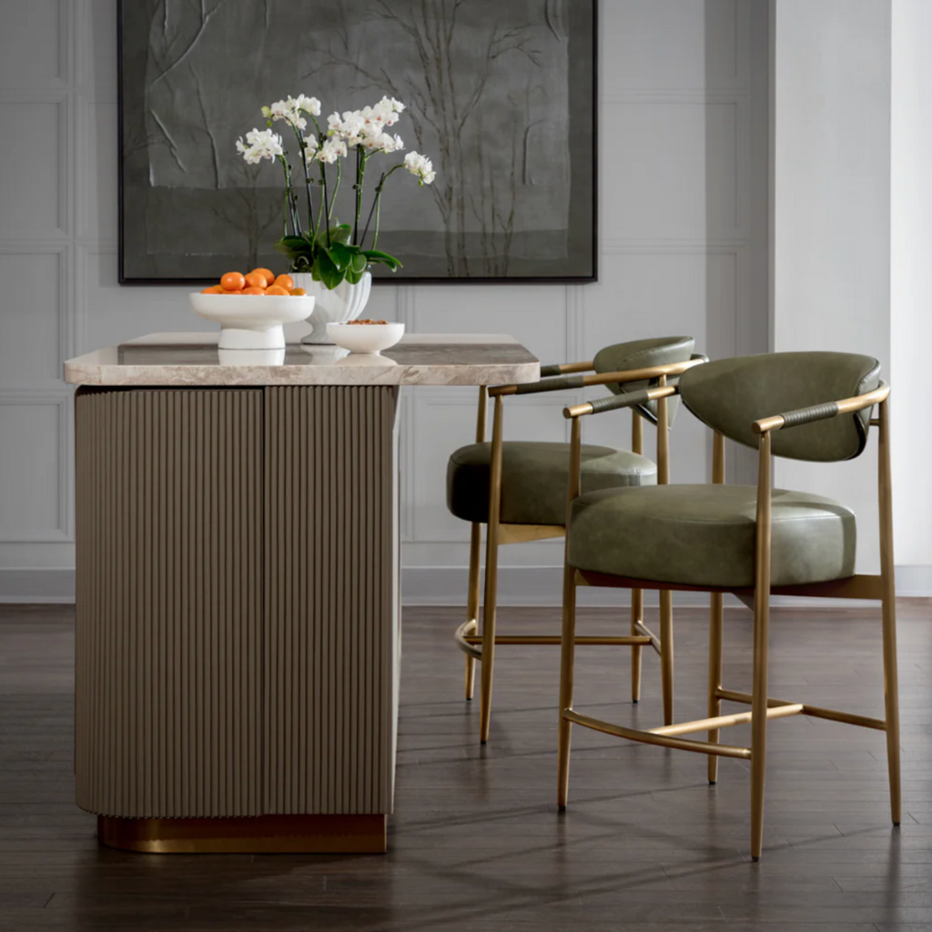 The Cataldi Kitchen Island brings a tactile elegance to the kitchen. A stark marble top rests above fluted panels wrapped in soft taupe faux leather, offering a subtle play of texture and tone. Inside, matching leather-lined shelving offers discreet storage, while brushed gold accents add a polished touch. Designed with versatility in mind, Cataldi can stand alone as a kitchen prep station, receptionist desk, or be paired with multiples as a stylish workspace.