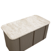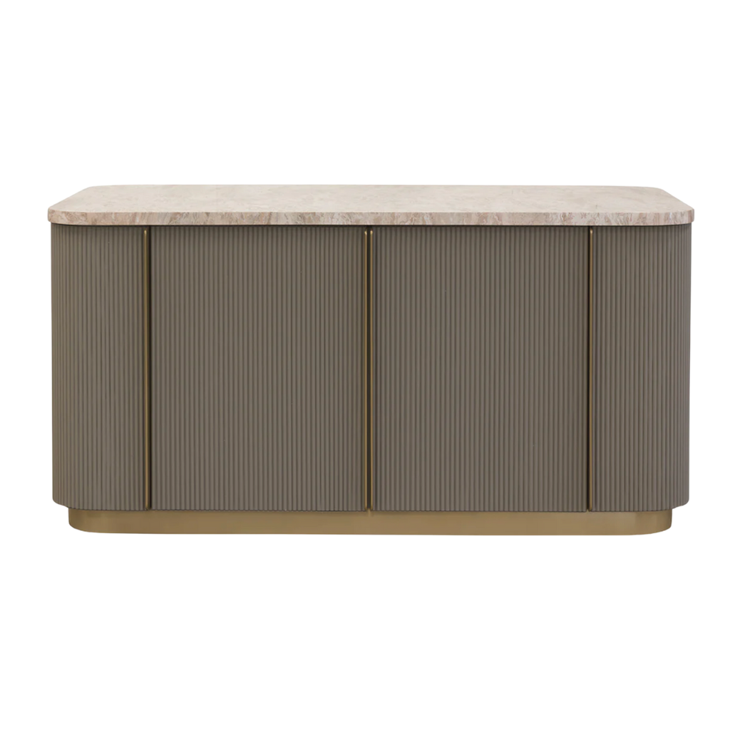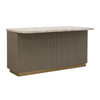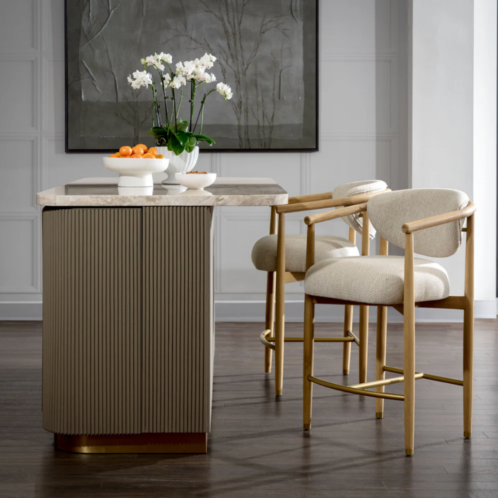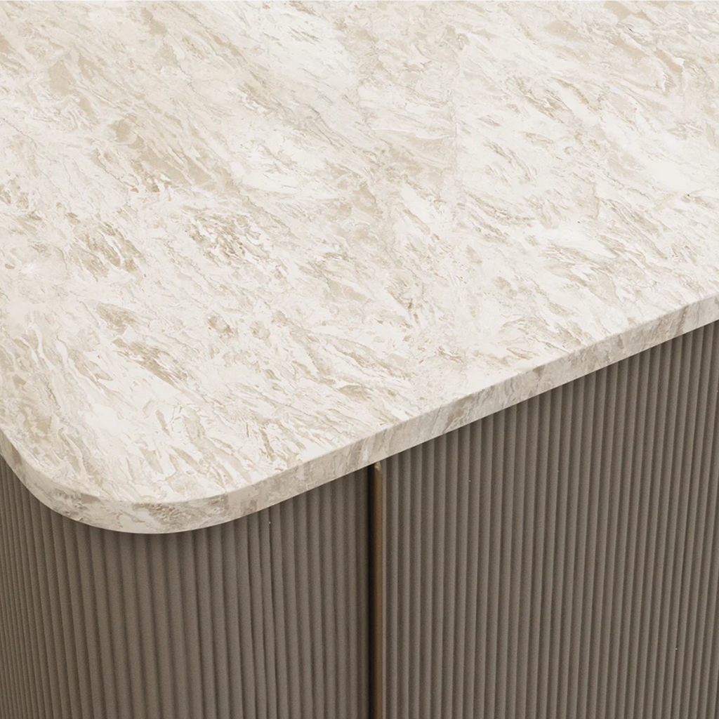The Cataldi Kitchen Island brings a tactile elegance to the kitchen. A stark marble top rests above fluted panels wrapped in soft taupe faux leather, offering a subtle play of texture and tone. Inside, matching leather-lined shelving offers discreet storage, while brushed gold accents add a polished touch. Designed with versatility in mind, Cataldi can stand alone as a kitchen prep station, receptionist desk, or be paired with multiples as a stylish workspace.