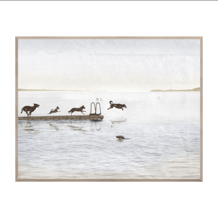 A fun-filled procession of joyful dogs leaps headlong off the edge of a dock in this charming aged photograph. The soft taupe and blue tones combine with a creased paper texture to create a dreamy image full of nostalgia.