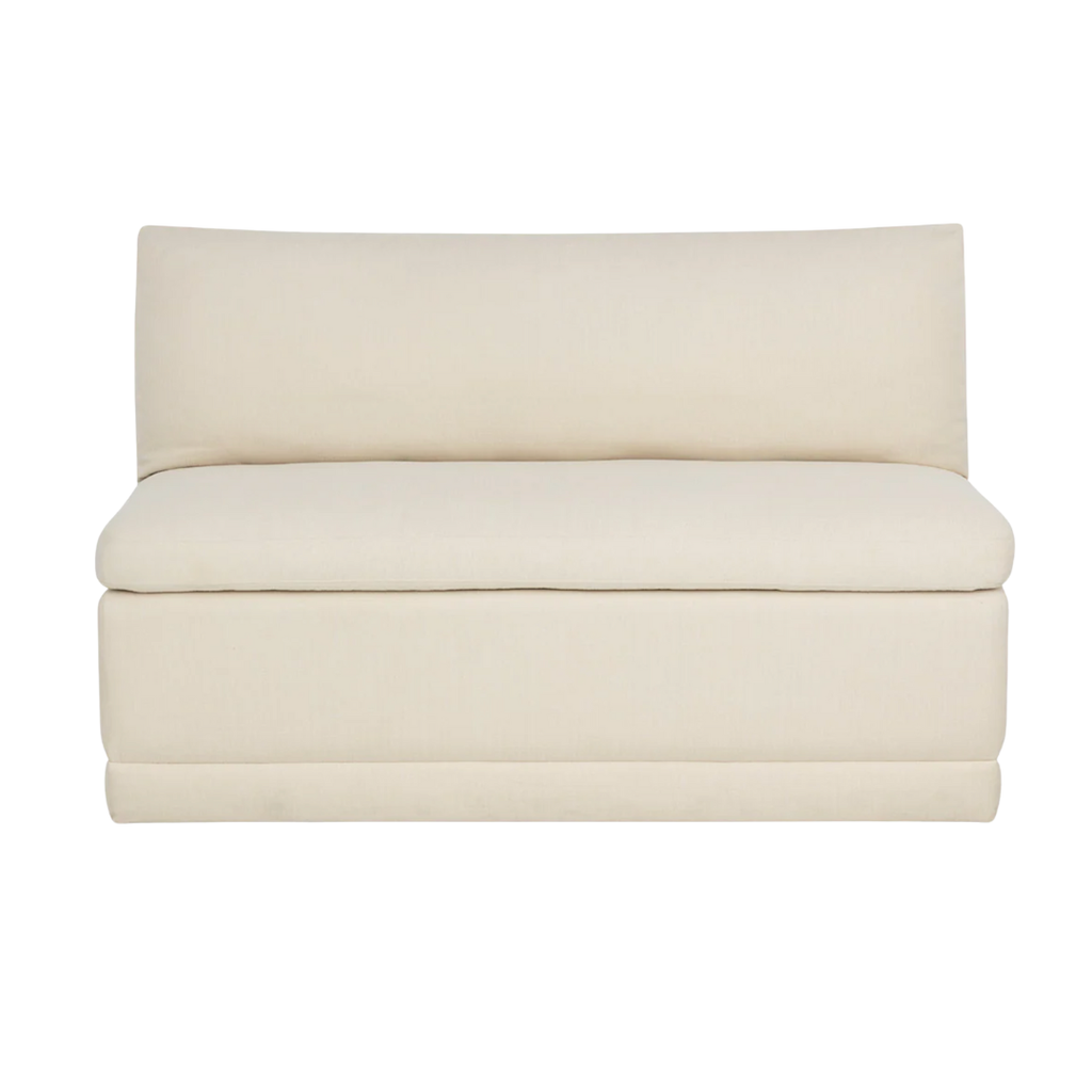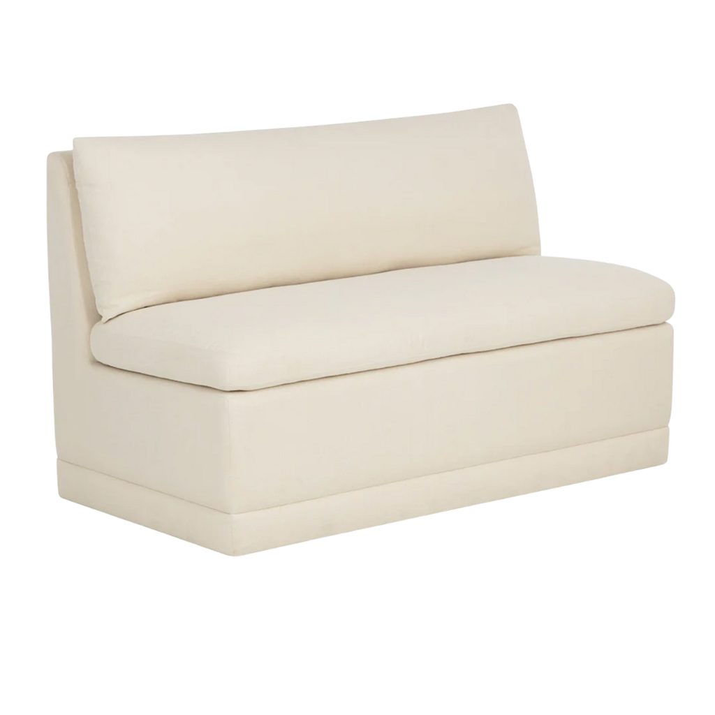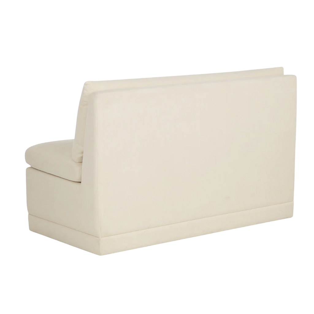 Elegant and inviting, the Donatella Banquette exudes cozy comfort. Fully upholstered in zenith alabaster performance fabric, it features a luxuriously plush seat and supportive back, making it a versatile choice for dining spaces, lounges, or built-in seating.