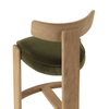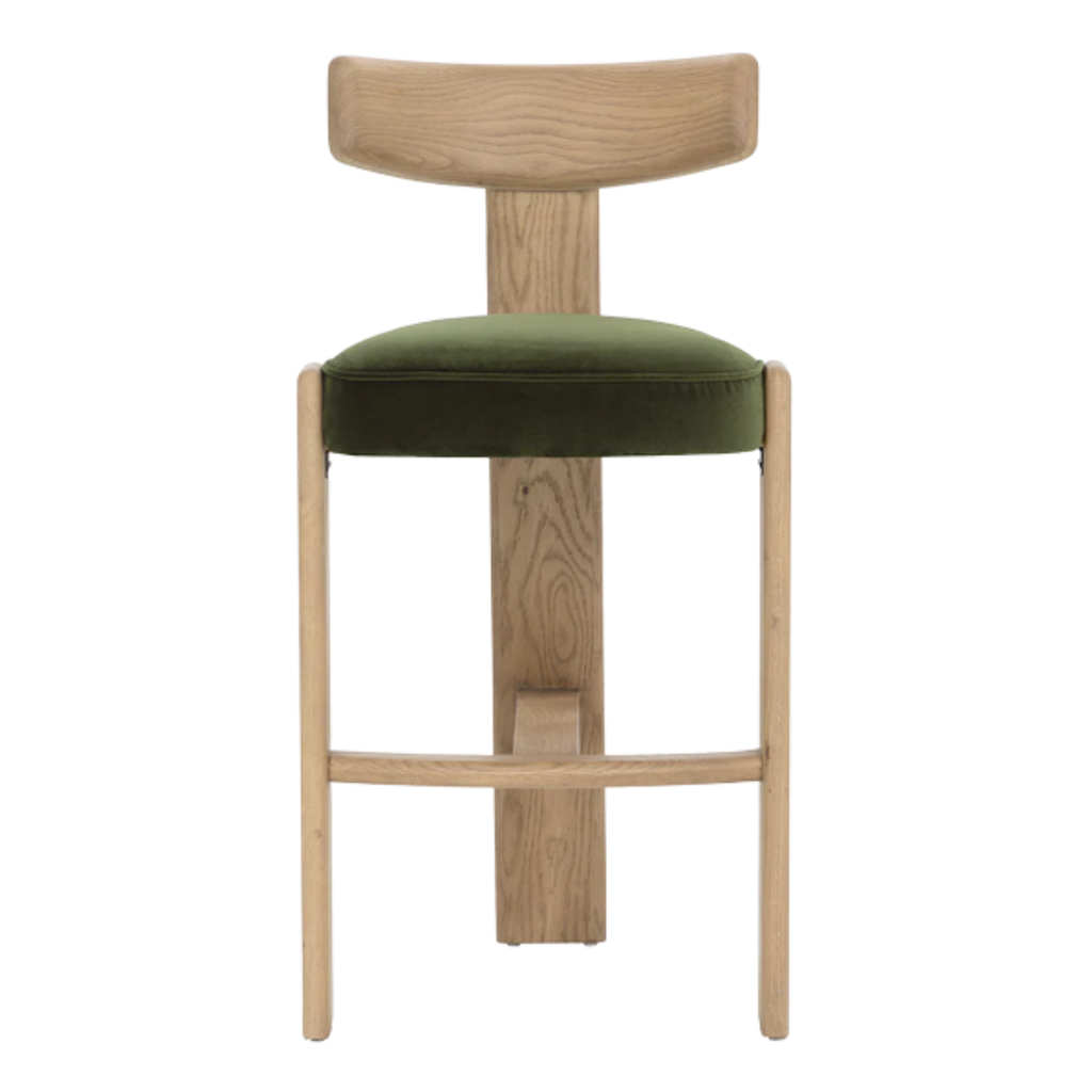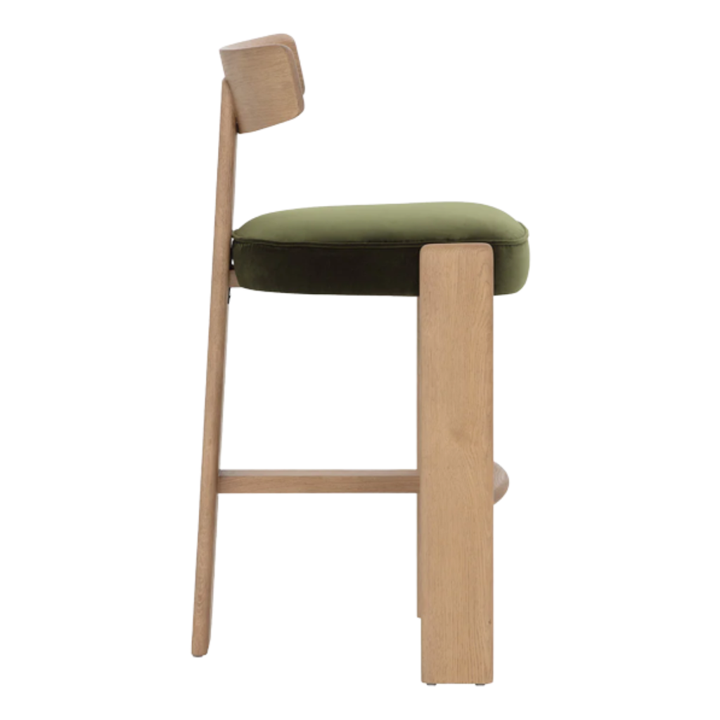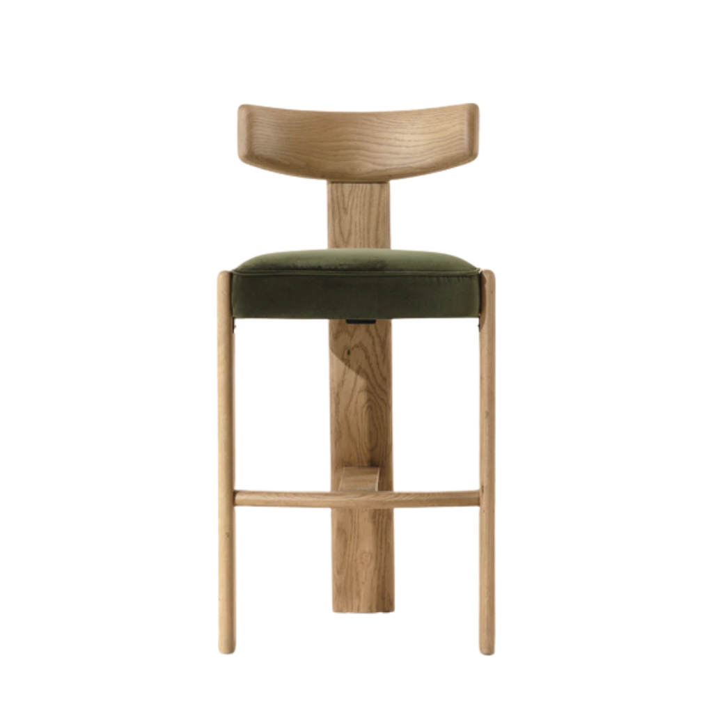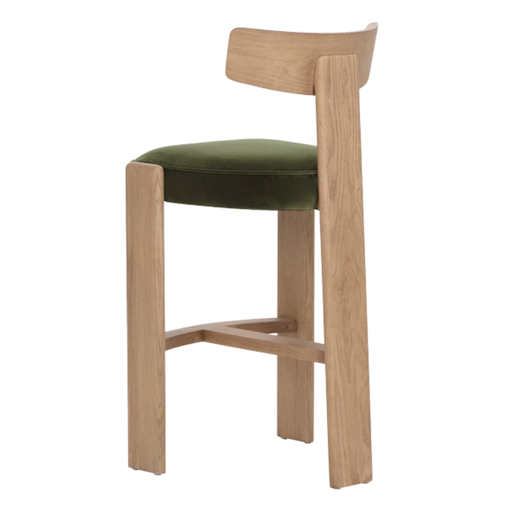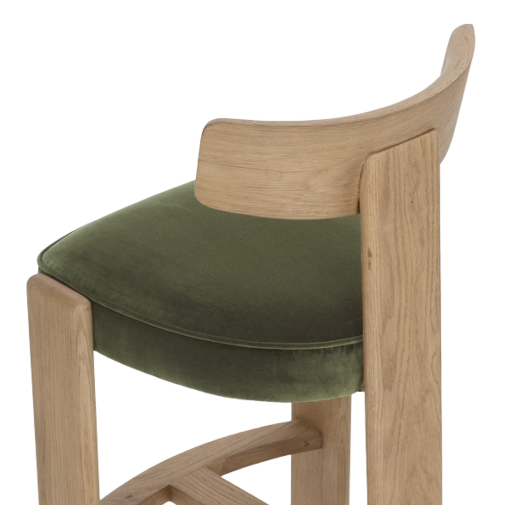 The Horton Barstool highlights the beauty of simplicity in contemporary design. A sculpted three-legged frame with a curved back constructed from rustic oak wood embraces the comfort of a beautiful seat upholstered in our forest green fabric.