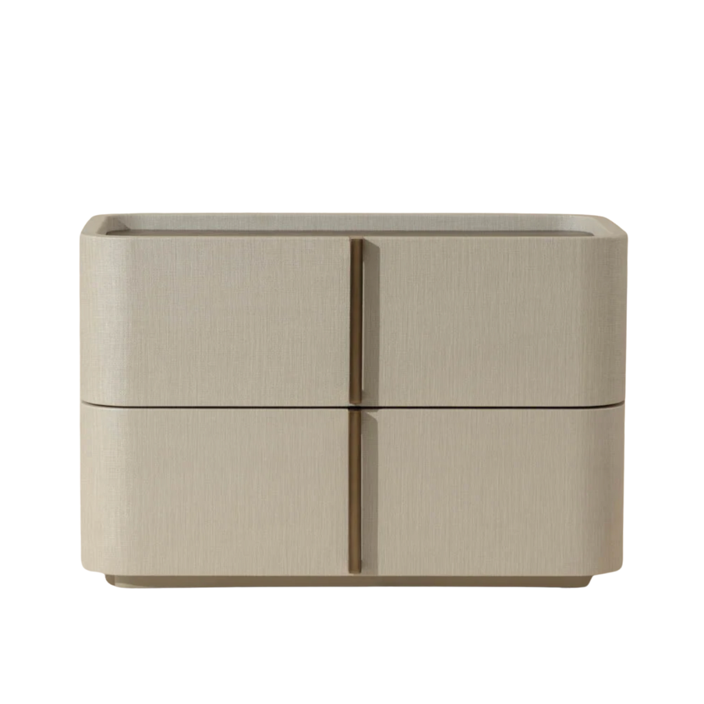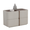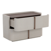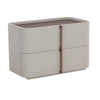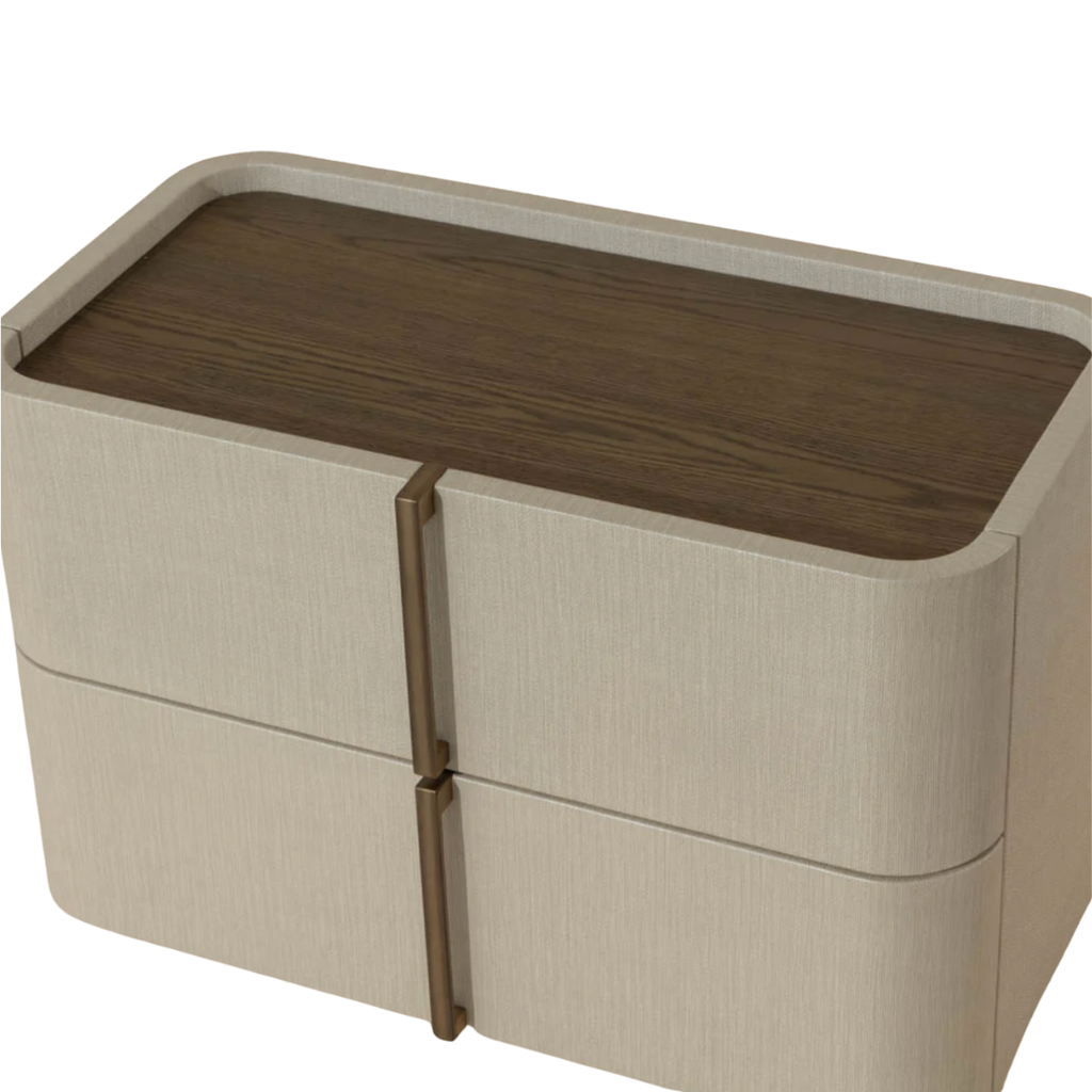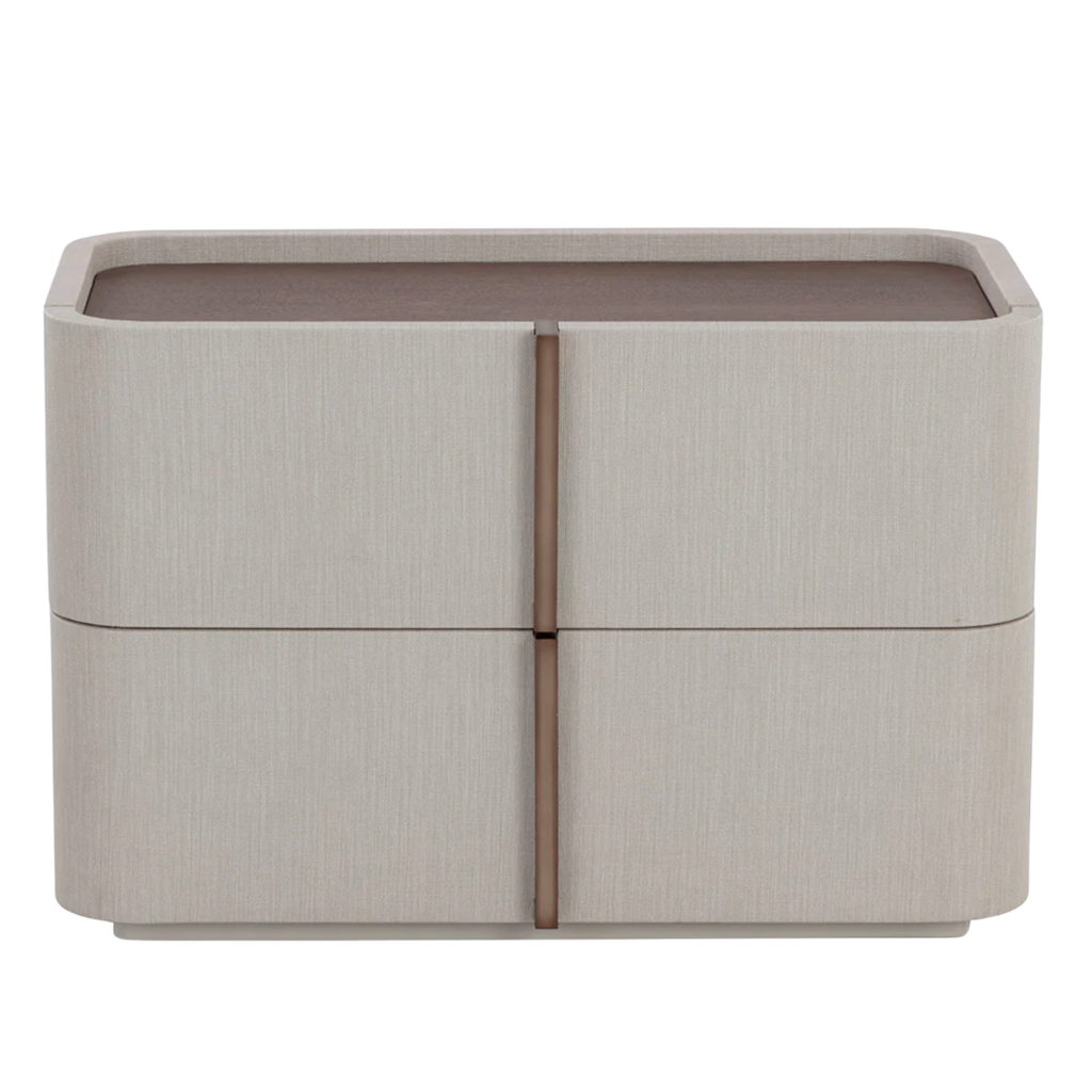 This contemporary large nightstand is defined by its beautiful and gentle curves. Wrapped in cream faux leather with a brown oak veneer tabletop that is sure to impress.