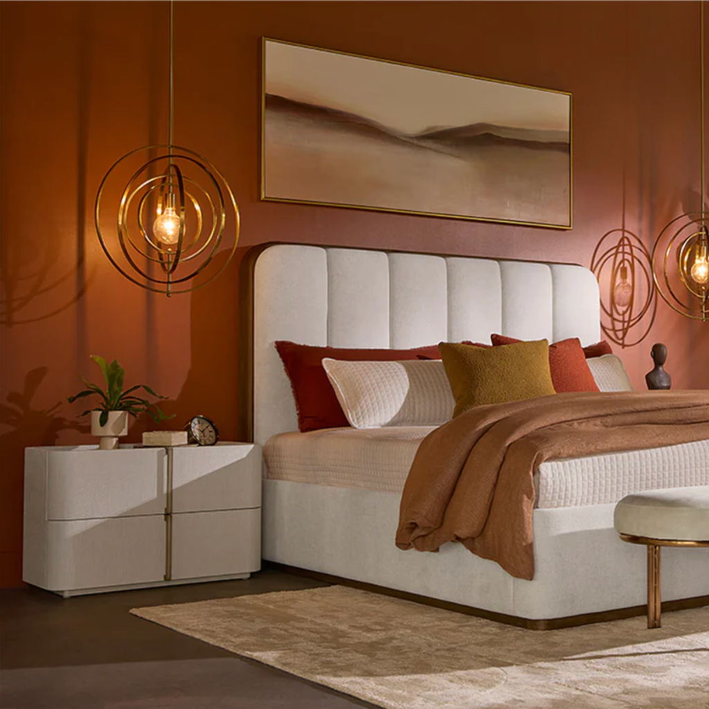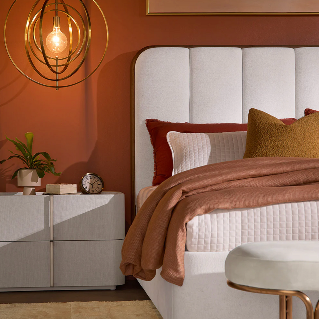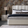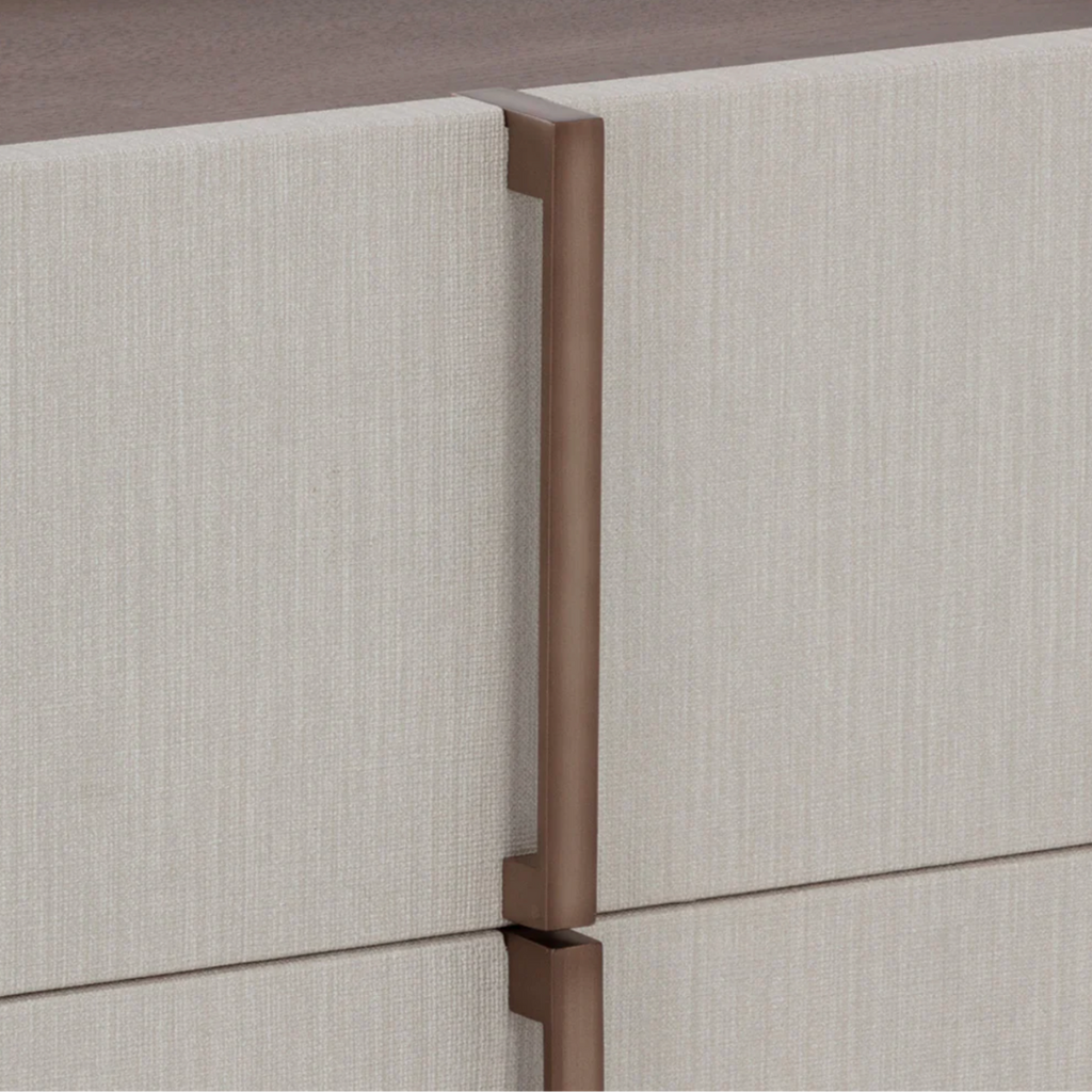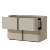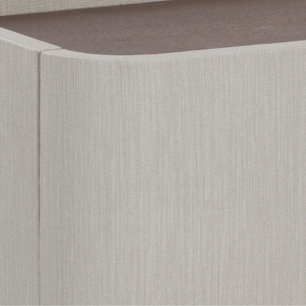 This contemporary large nightstand is defined by its beautiful and gentle curves. Wrapped in cream faux leather with a brown oak veneer tabletop that is sure to impress.