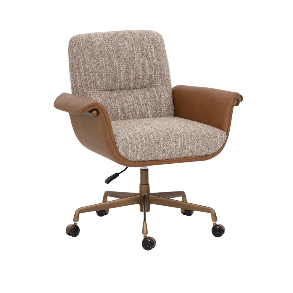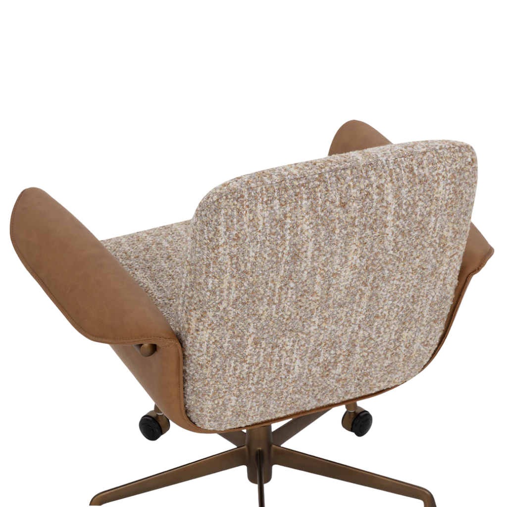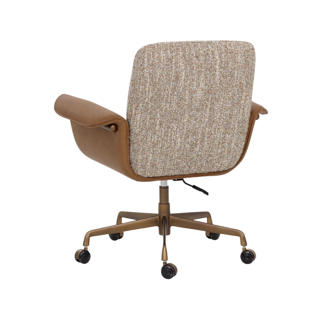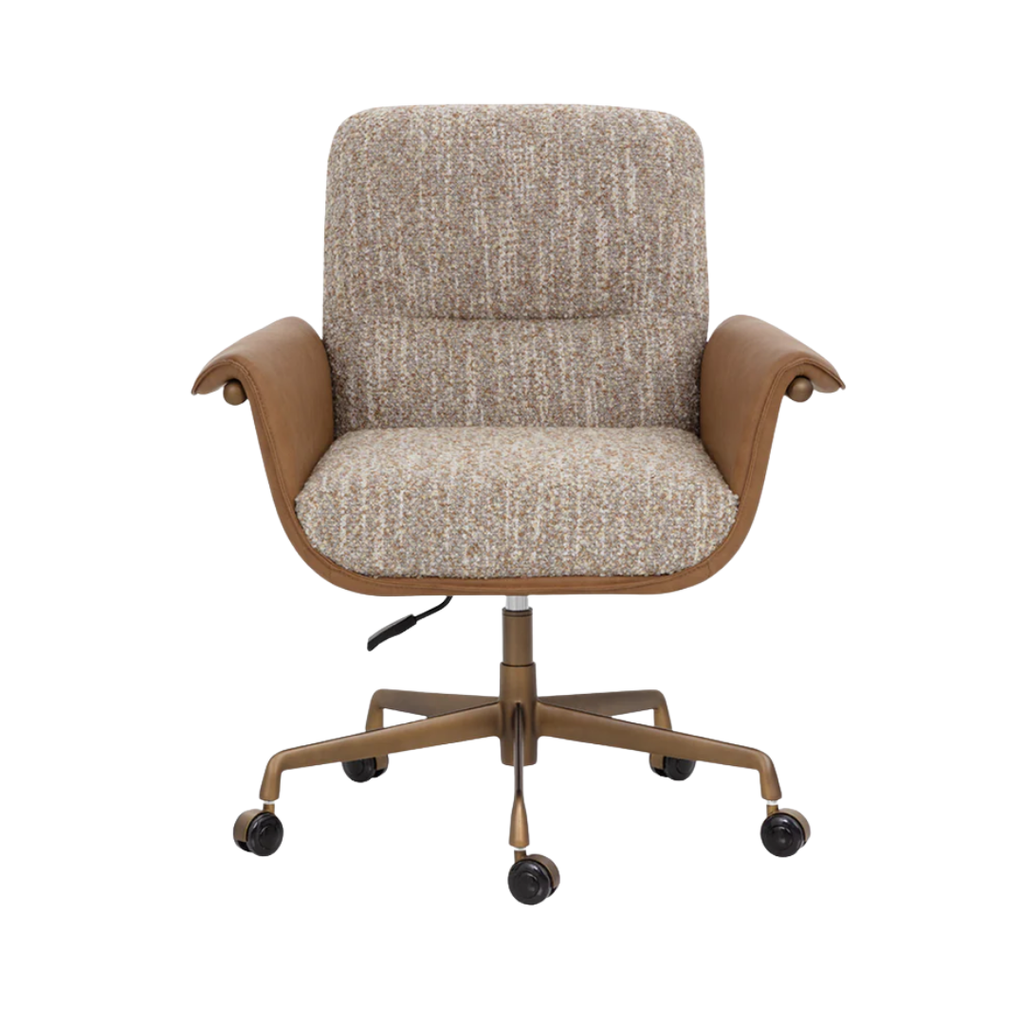 The Lomax Office Chair is a balance of utility and craftsmanship in a two-tone design. The seat and backrest are upholstered in textured dusty greige fabric, framed by metal arms clad in milliken cognac faux leather. The arms fold gracefully over the sides, softening the industrial edge of the structure while emphasizing the layered mix of materials. A rustic bronze steel base completes the design.