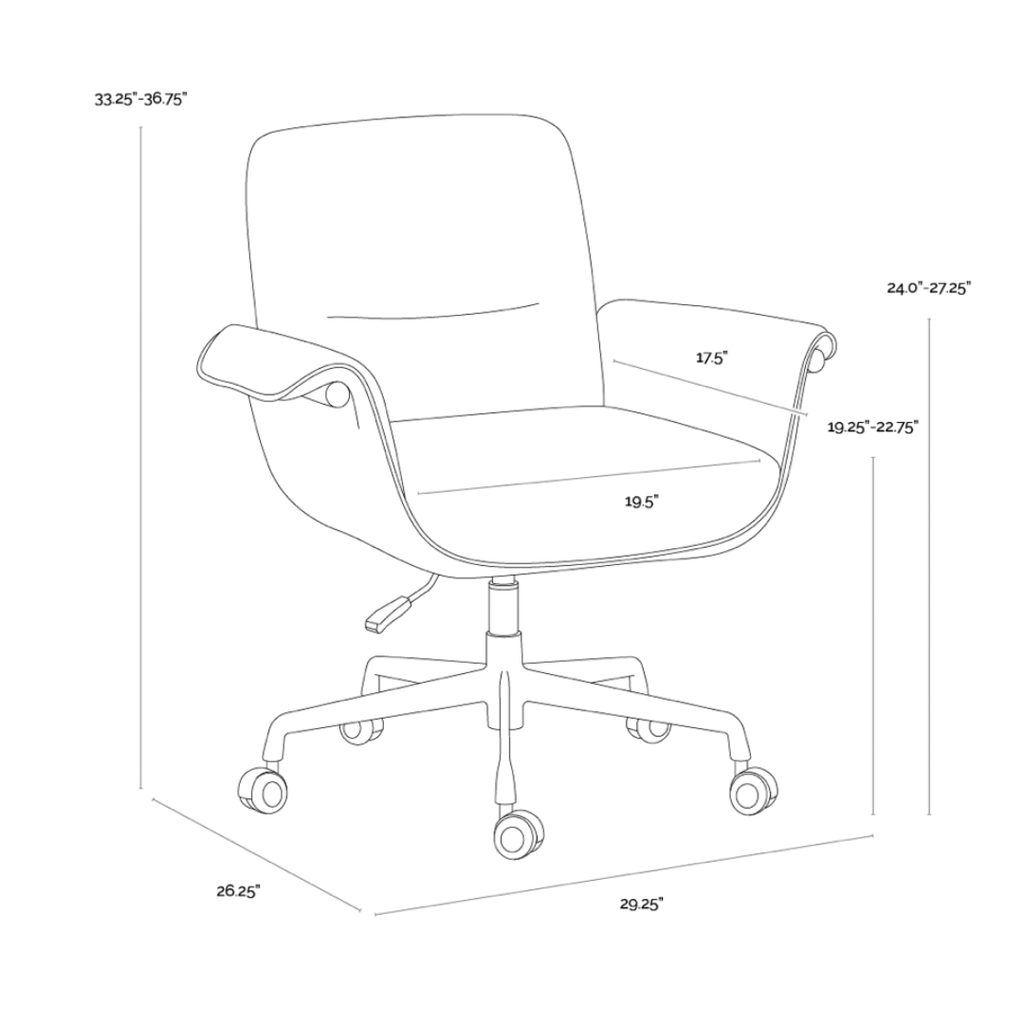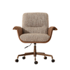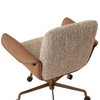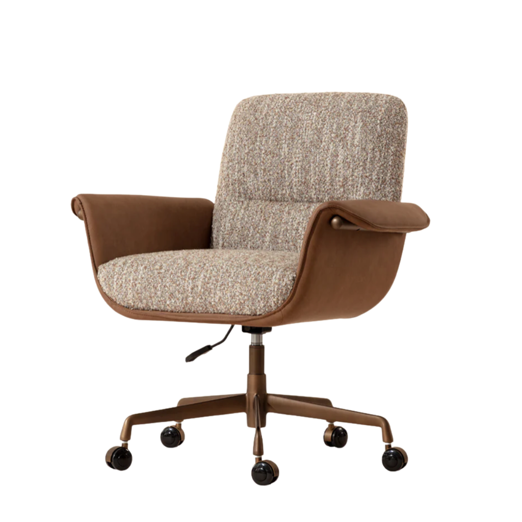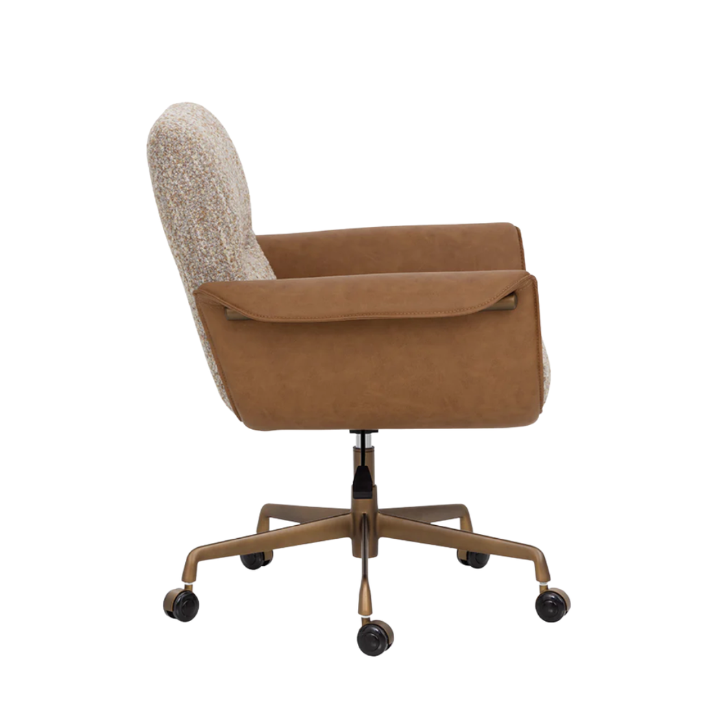 The Lomax Office Chair is a balance of utility and craftsmanship in a two-tone design. The seat and backrest are upholstered in textured dusty greige fabric, framed by metal arms clad in milliken cognac faux leather. The arms fold gracefully over the sides, softening the industrial edge of the structure while emphasizing the layered mix of materials. A rustic bronze steel base completes the design.
