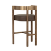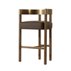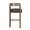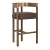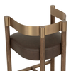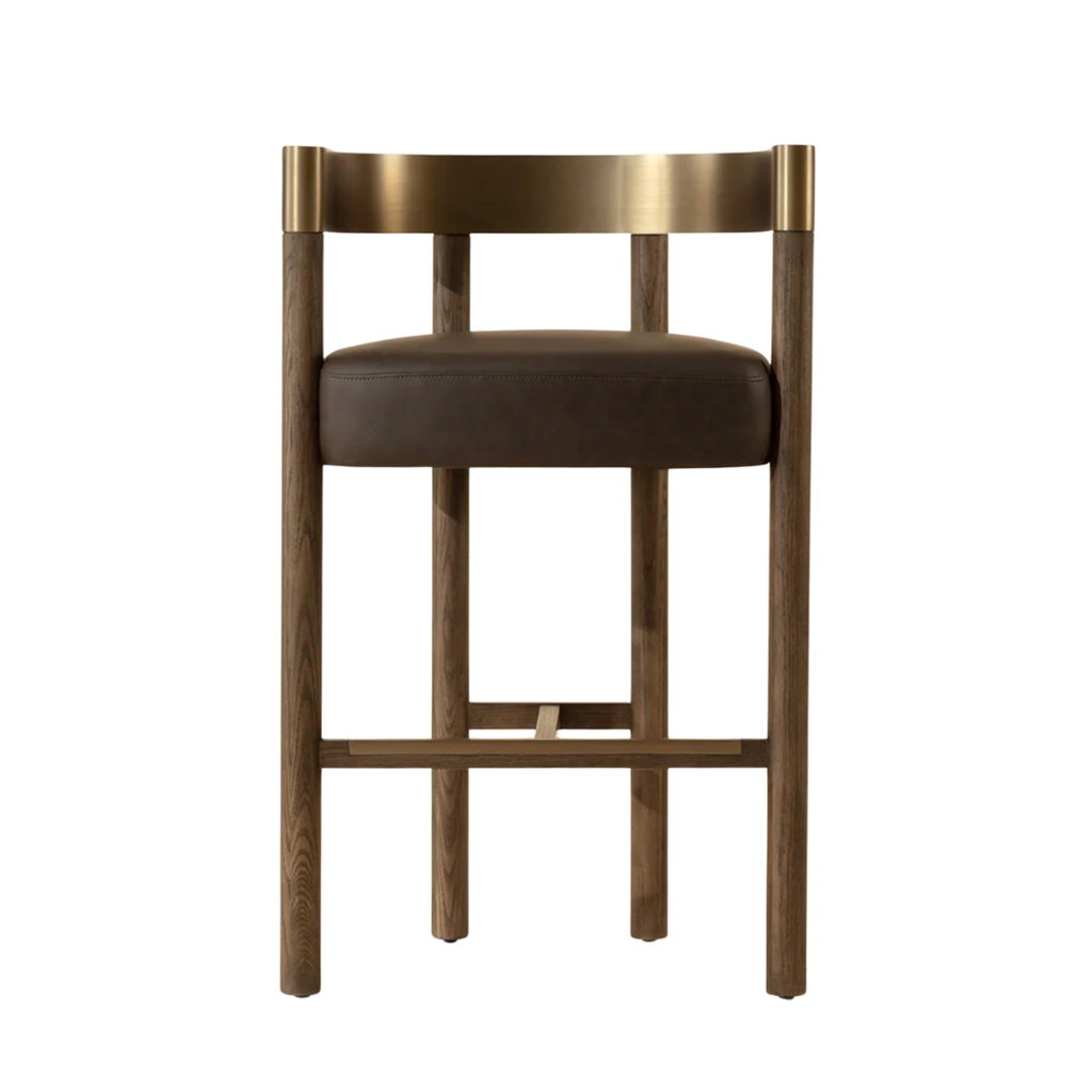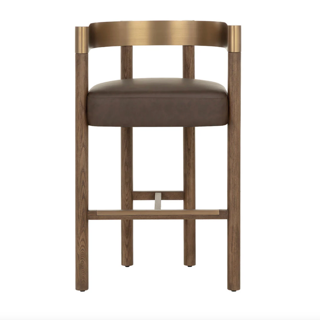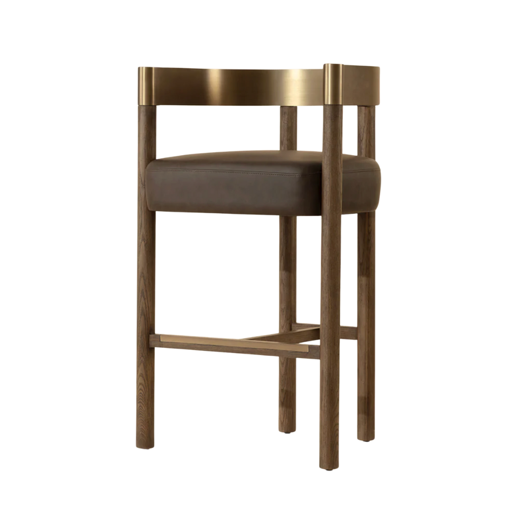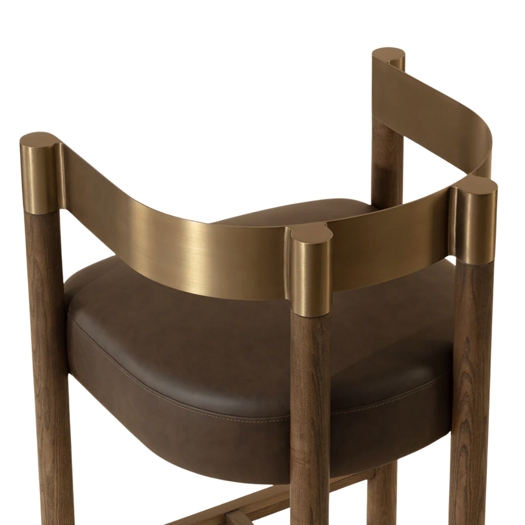 The Manolo Counter Stool plays with contour and contrast. Its curved antique brass stainless steel backrest, paired with a rich chocolate ash wood frame, cradles a generously cushioned seat in smooth milliken espresso faux leather. The result is an elegant, modern profile that stands beautifully on its own.