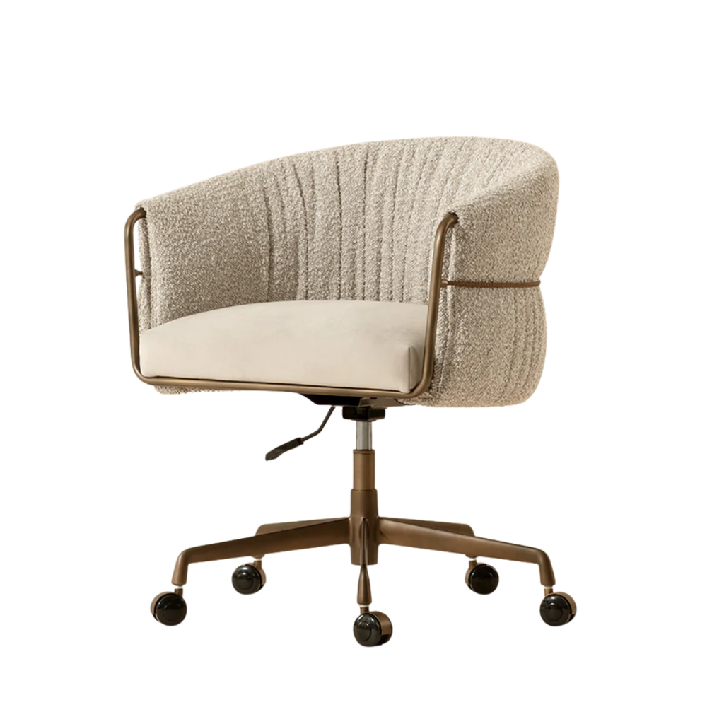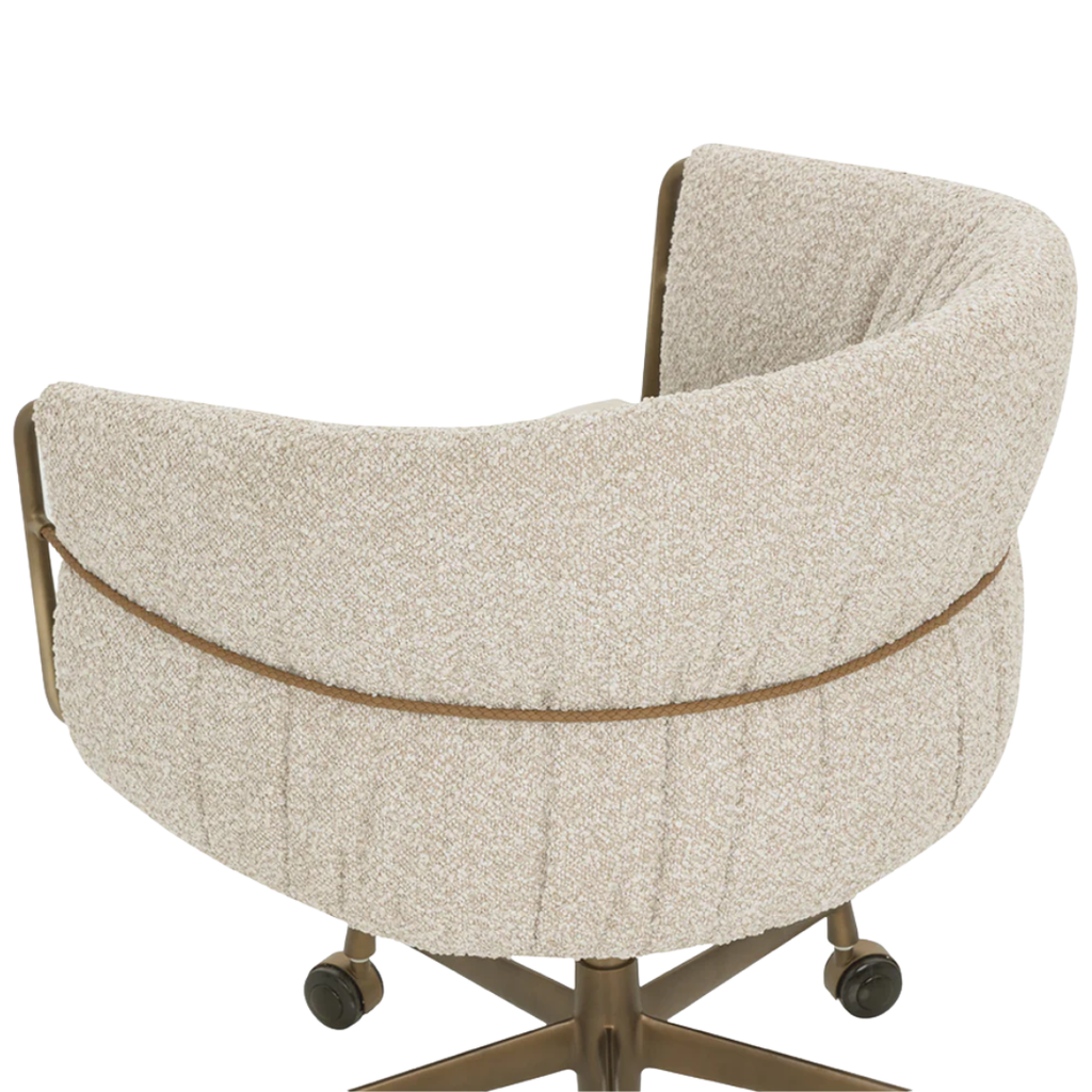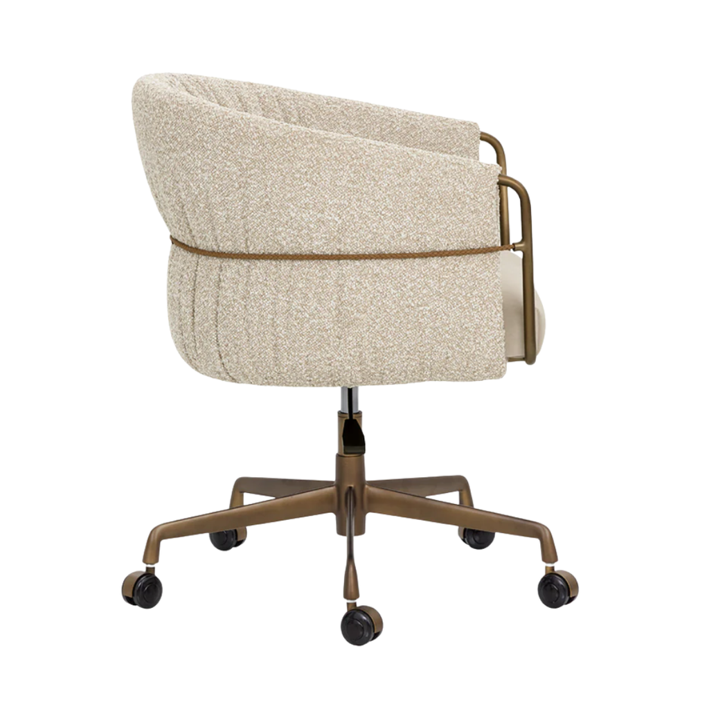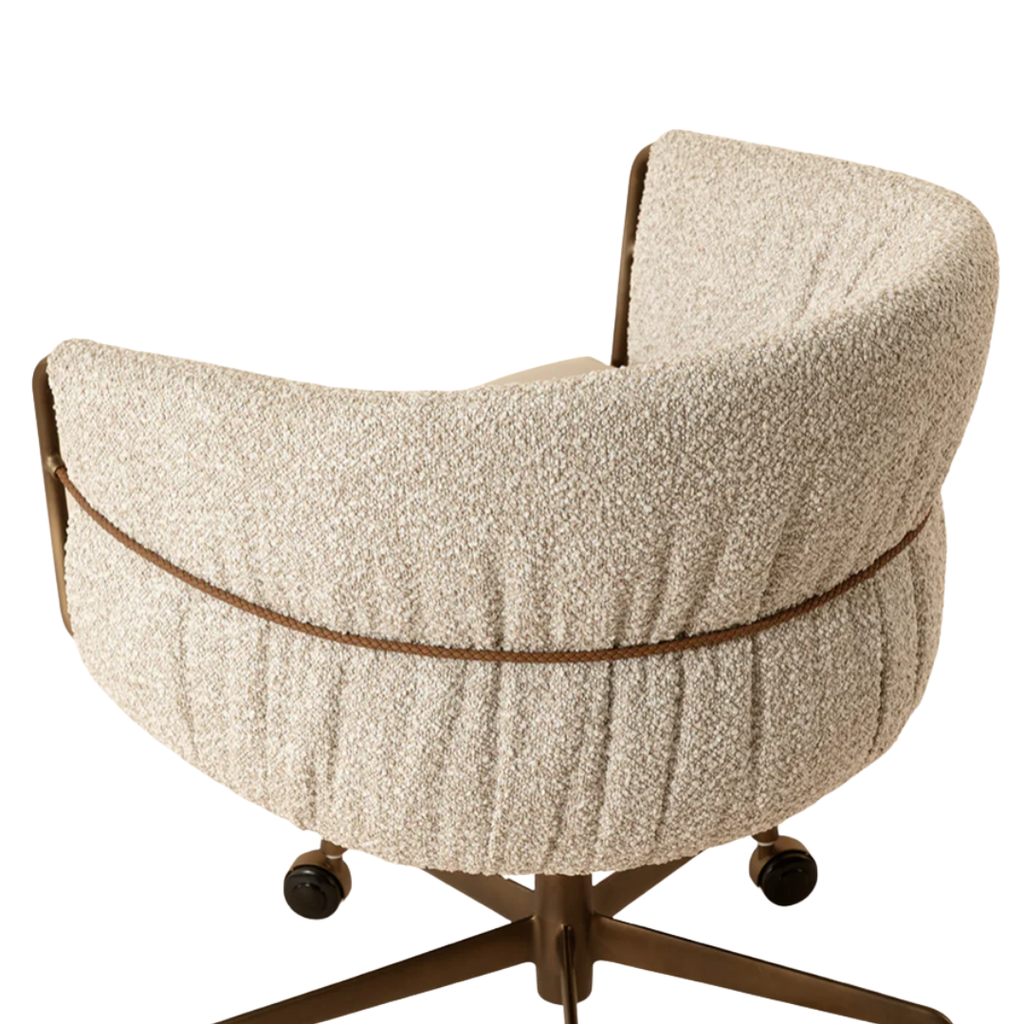 The Olma Office Chair is a balance of comfort and utility. Its curved backrest is upholstered in plush santa cruz oatmeal fabric, contrasted by a smooth meg taupe seat. A slim woven rope accent traces the iron frame, while the fabric subtly folds and wraps around the arms, leaving portions of the frame exposed for a layered look. A rustic bronze steel base completes the design.