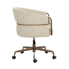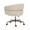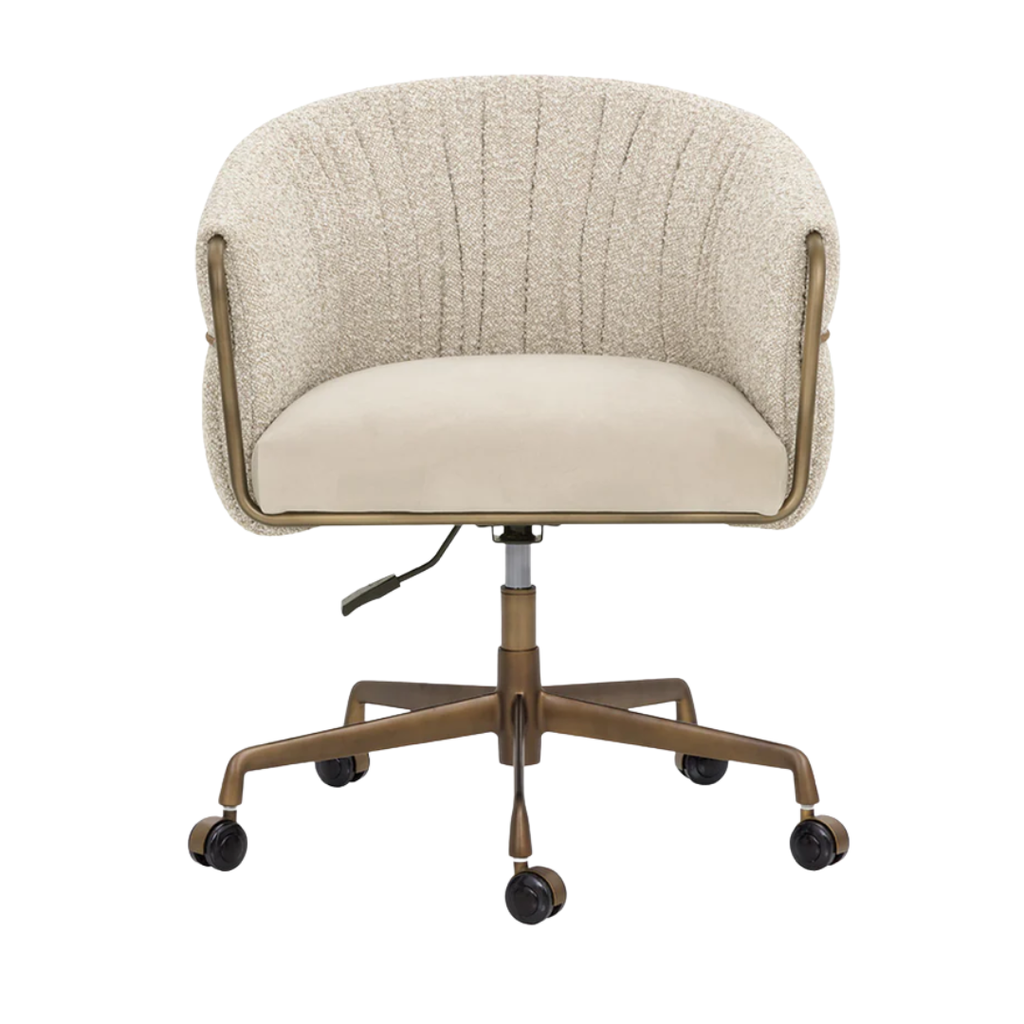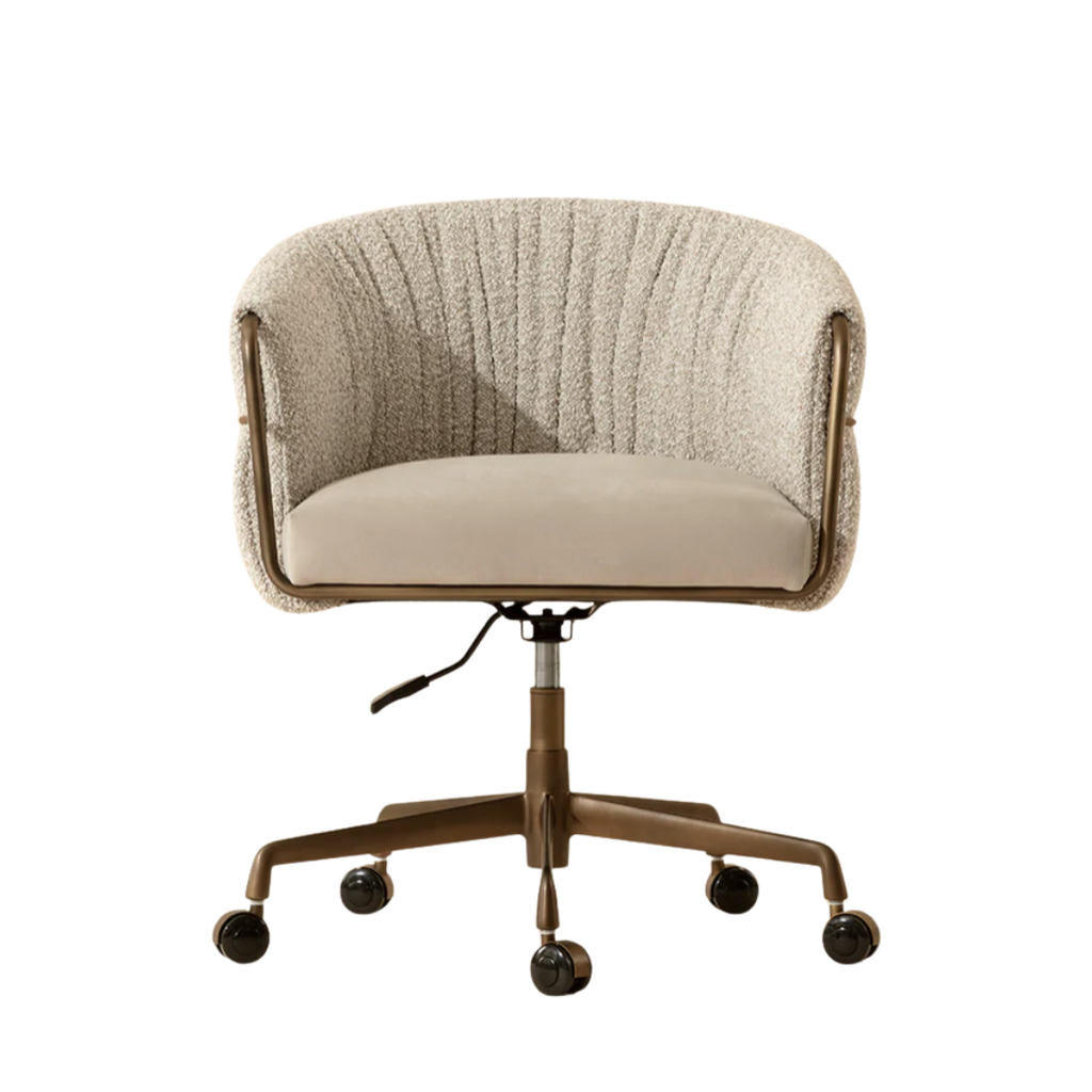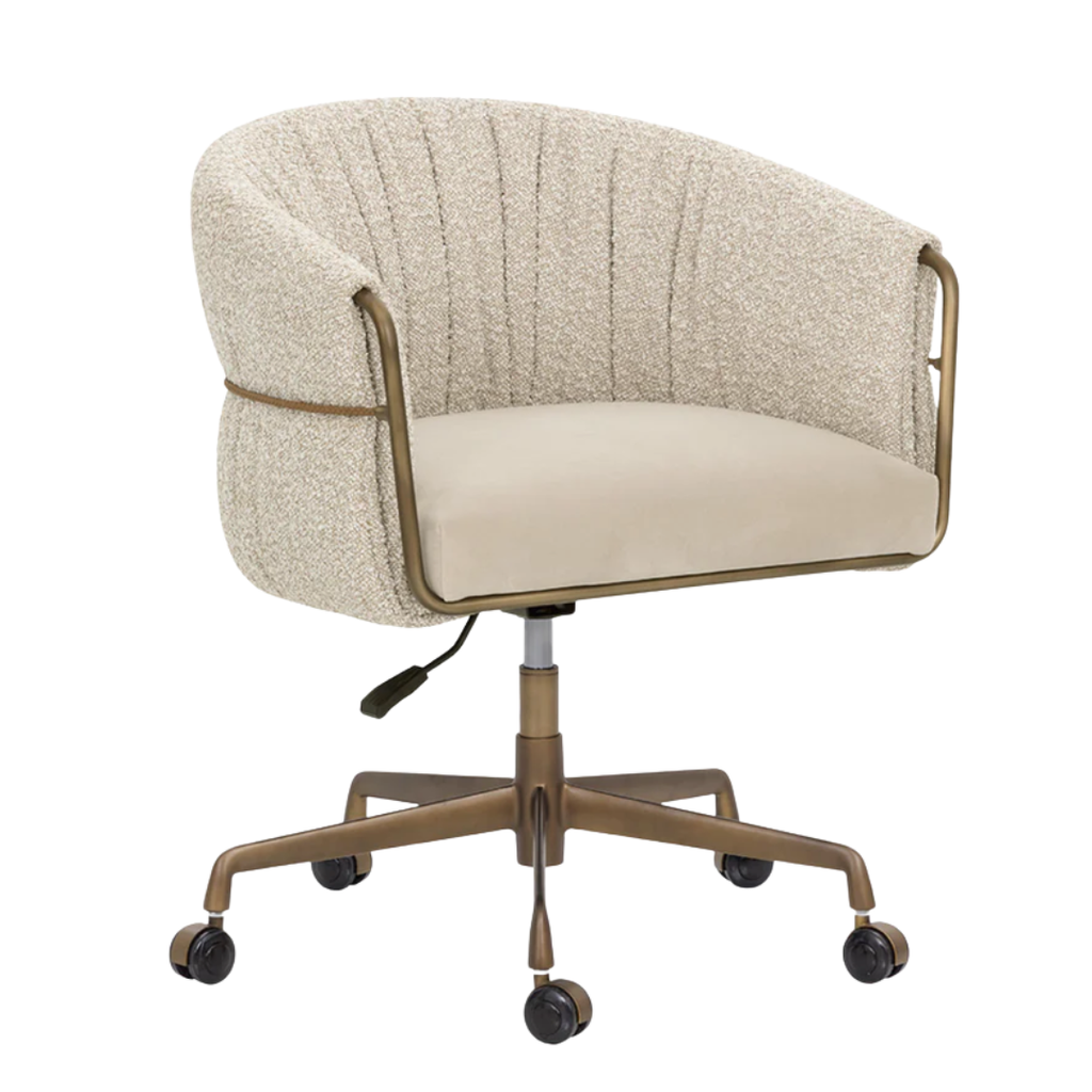 The Olma Office Chair is a balance of comfort and utility. Its curved backrest is upholstered in plush santa cruz oatmeal fabric, contrasted by a smooth meg taupe seat. A slim woven rope accent traces the iron frame, while the fabric subtly folds and wraps around the arms, leaving portions of the frame exposed for a layered look. A rustic bronze steel base completes the design.