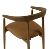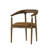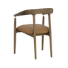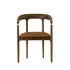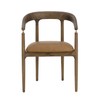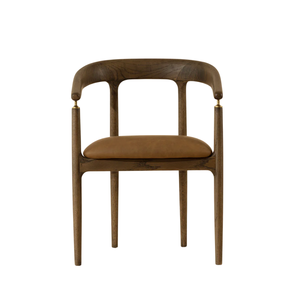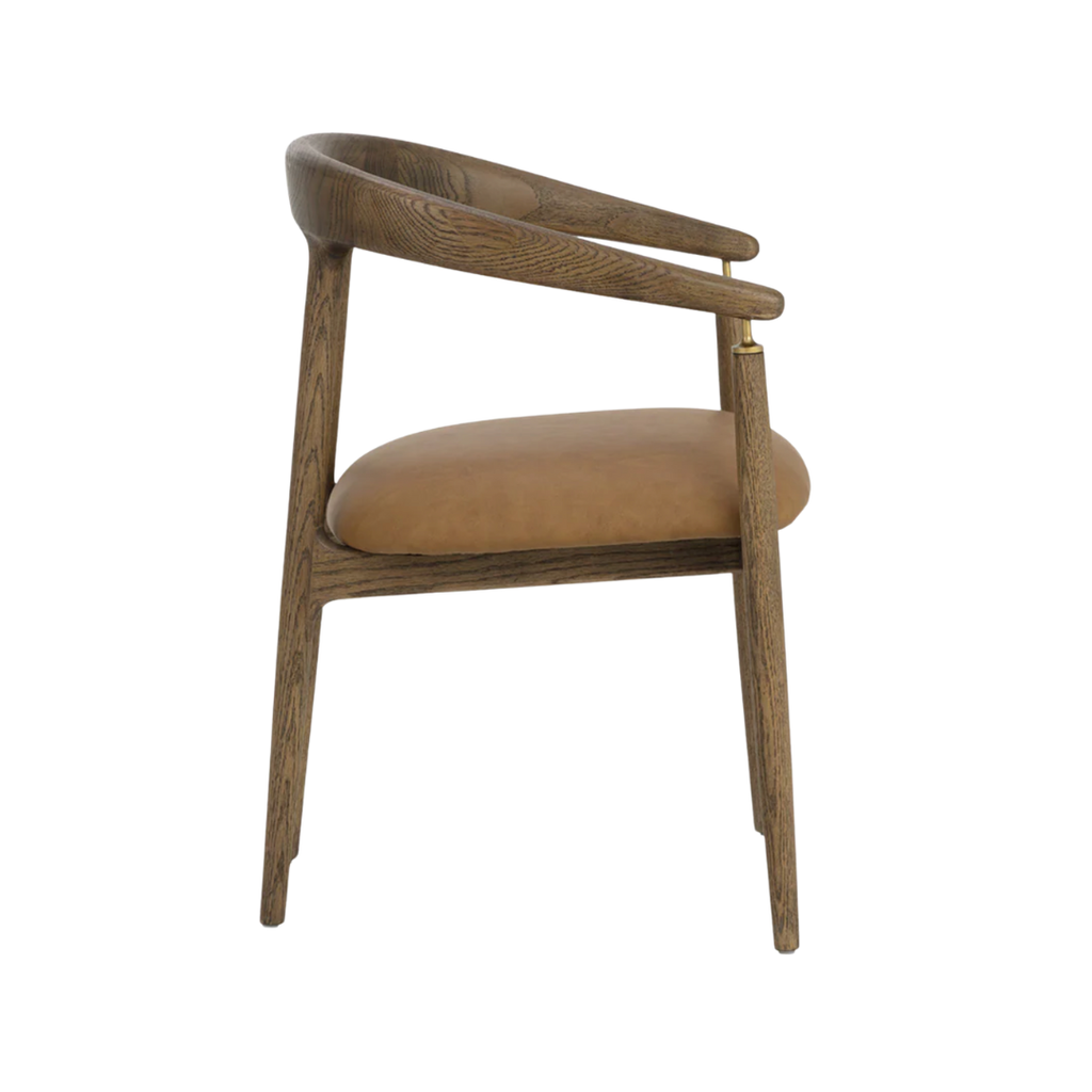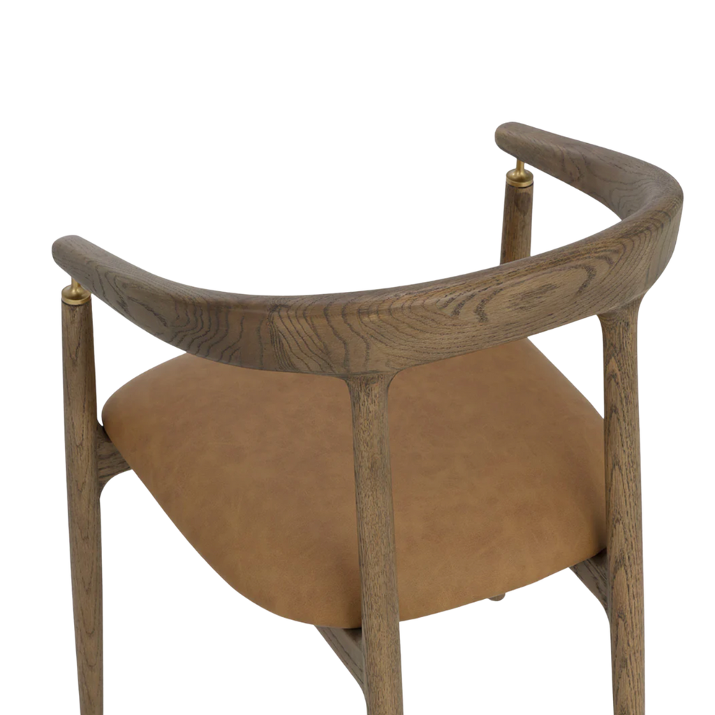 The Valmont Dining Armchair pairs a solid oak frame with a seat upholstered in durable faux leather. Its curved back and low arms are anchored by a small but striking detail: brushed brass fittings that connect the armrest to the frame. With a striking mid-century modern design, the Valmont highlights skilled craftsmanship and distinctive character.